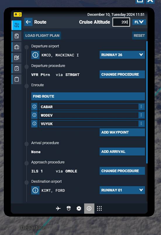 - Using flight plan that was set in EFB (IFR; FL200; VFR Straight departure; CABAR - WODEV - VUYUK; Approach: ILS 1 via OMOLE)