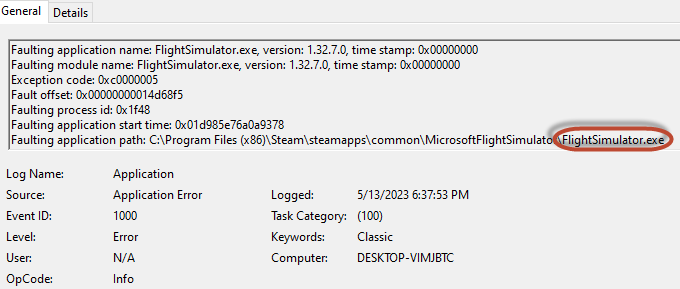 I have been getting regular CTDs over the past three days, as well… and I have never had them before in almost a year of using MSFS. The only thing that changed was a Windows update that I took a few days ago that seems to coincide with the CTDs. They seem to happen almost randomly - I had one that CTD’ed about an hour in to a flight, then yesterday I had one as I was setting up a flight from cold and dark. Different aircraft - one was the PMDG 739 and the other was in the default Citation. Wonder if the windows update was causing this? My fault code is a bit different than yours, though. From the windows event log. I see the same error every time I CTD.