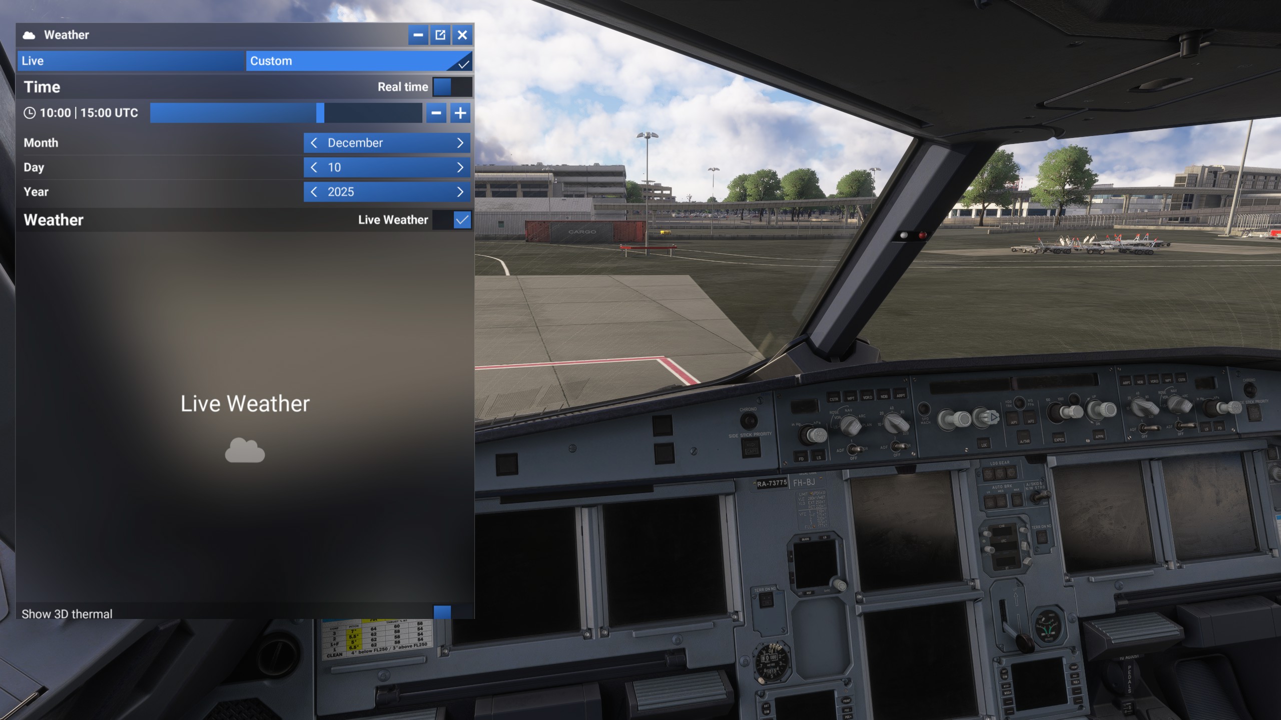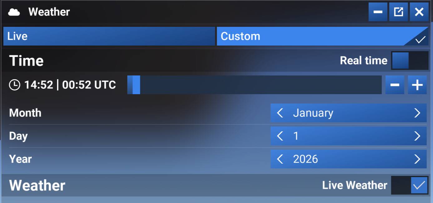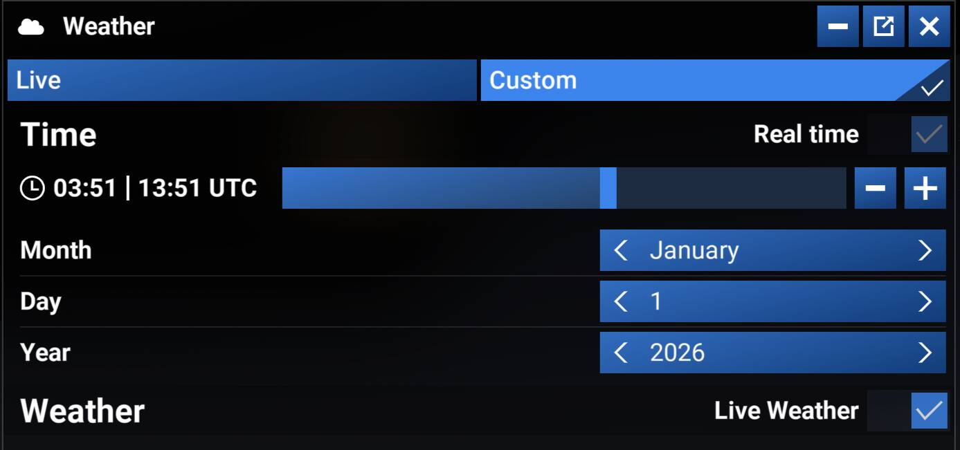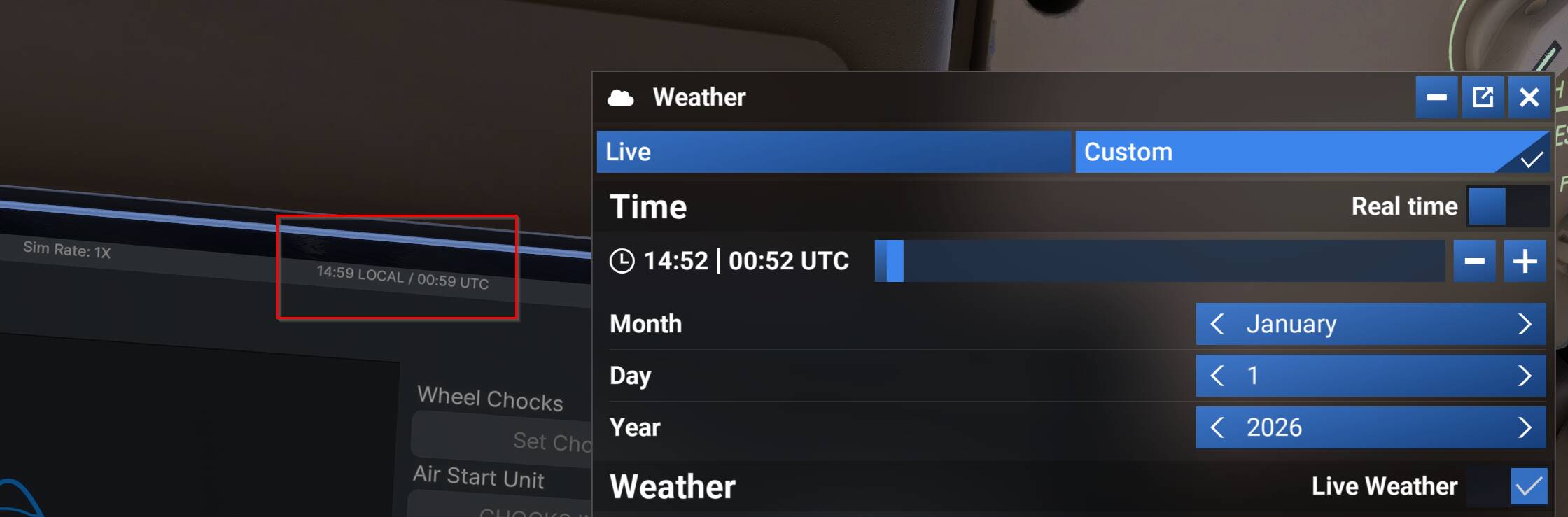 Description of the issue: I start the flight and set custom time when flight is loaded. Time remains still. Let’s say I set time 10:00 and start my startup procedure. After a few minutes the time is still 10:00. Weather and daylight conditions are not changing as well. Custom time can be set before loading the flight or during the flight. Doesn’t matter. The custom time stops working when I simply go to the weather menu.