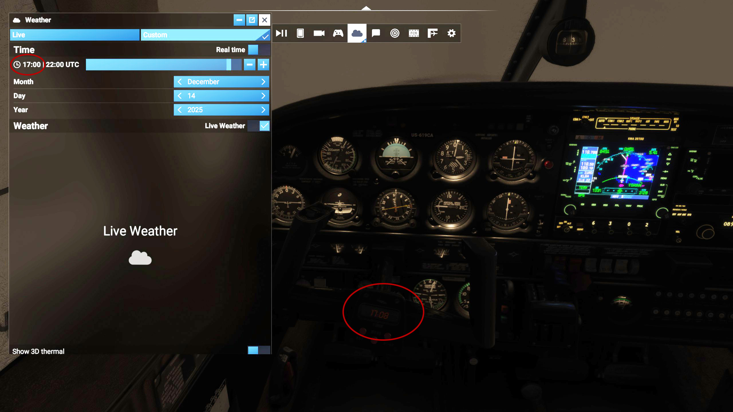 Here is good and obvious demonstration of the custom time glitch. Piper Arrow has clock on its yoke. I set custom time BEFORE the flight to 17:00 and started a flight.