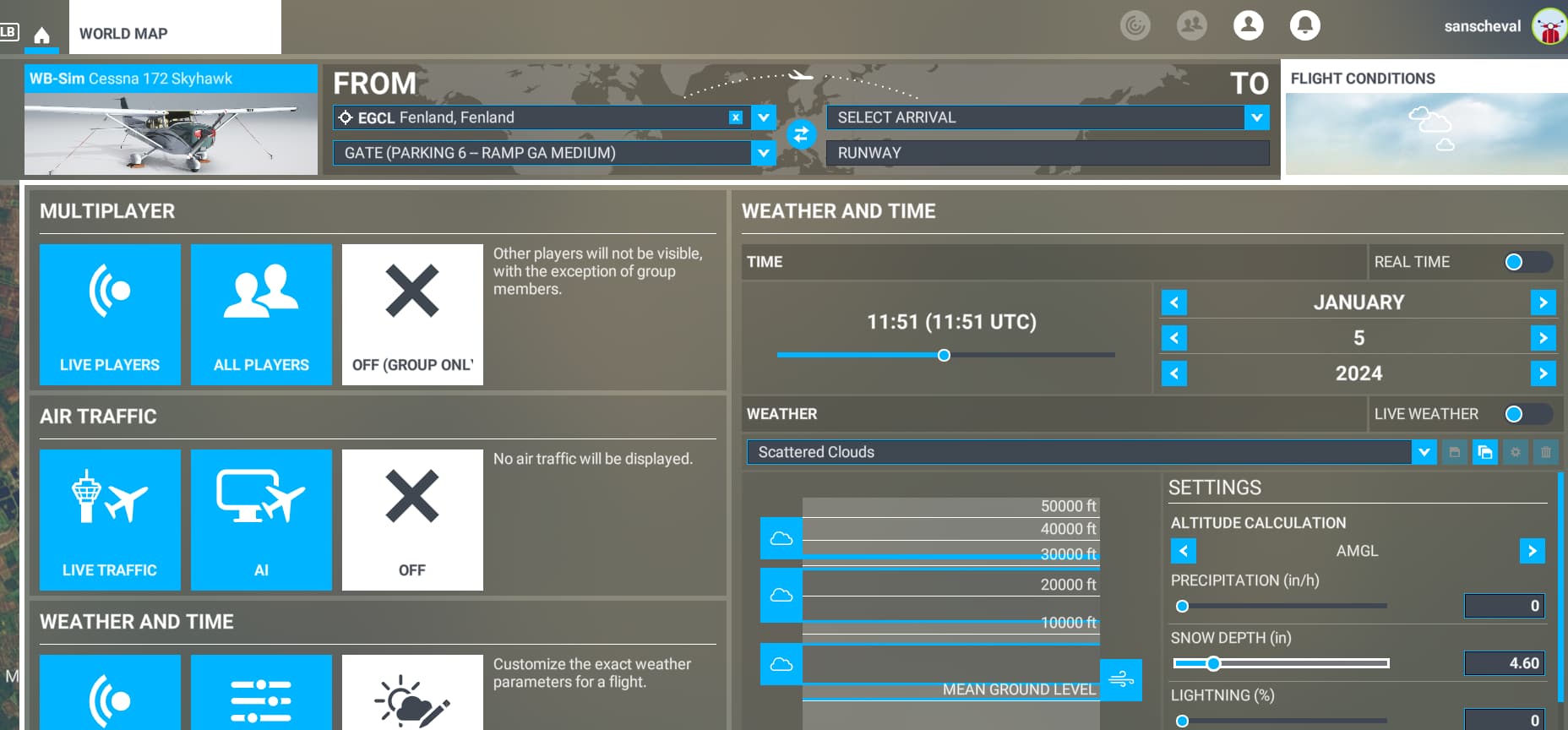 - Flight Conditions - Set for example Broken Clouds preset