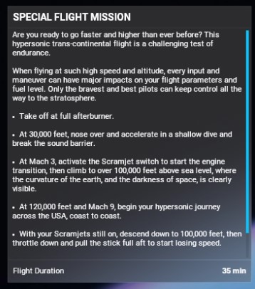 When I first did the Dark Star mission I took some time to memorize the instructions in the menu, then in the cockpit I found this MACH profile, okay that’s different (and more detailed), lets memorize that, wrote some notes on a piece of paper. Then during mission the objectives point out yet a different profile… The first few tries I didn’t even see any objectives because I had them turned off, I thought, serious Asobo no instructions whatsoever. Maybe warn people to turn the objectives ON or have them on by default in training missions.