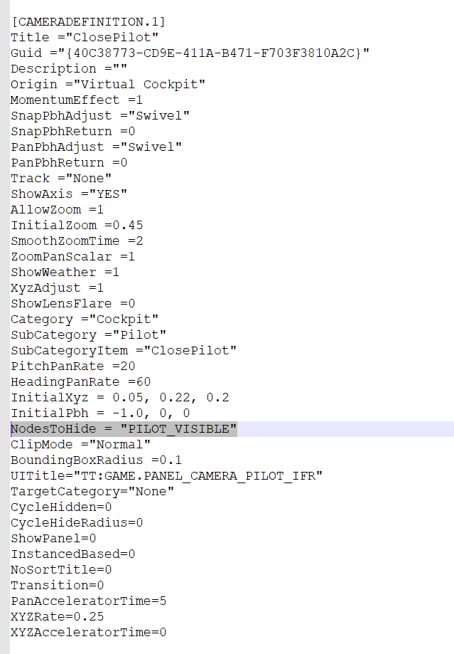 It’s the custom cameras I the keybind is called using the alt+1 key so not the pre set cameras as the code says so it seems like there’s just no support for custom cameras. Would it not be possible disable the pilot if the camera position is within a set a boundary around each cockpit possibly so if the camera is in that space the pilot won’t get in way but if leave the area the pilot comes back?