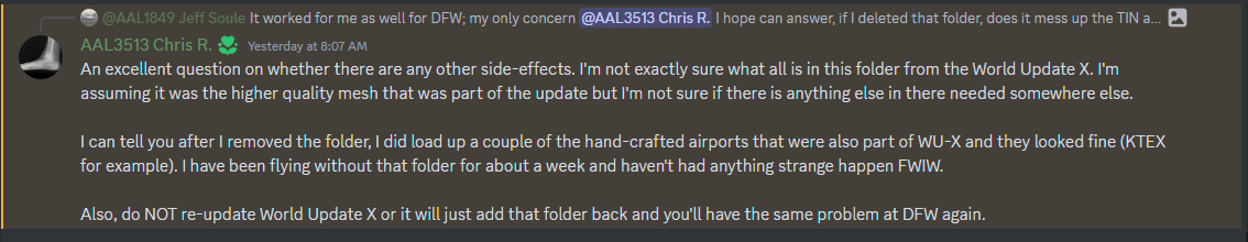 One other thing to note: I am not a tech wizard like some of you; I’m just sharing info from several others in a virtual airline discord who have had the same issues I’ve had w/ DFW (even with SU15). Please make a copy of that folder in the case it messes something up, but per the OP who found this, he doesn’t believe it’s changed anything from his end.