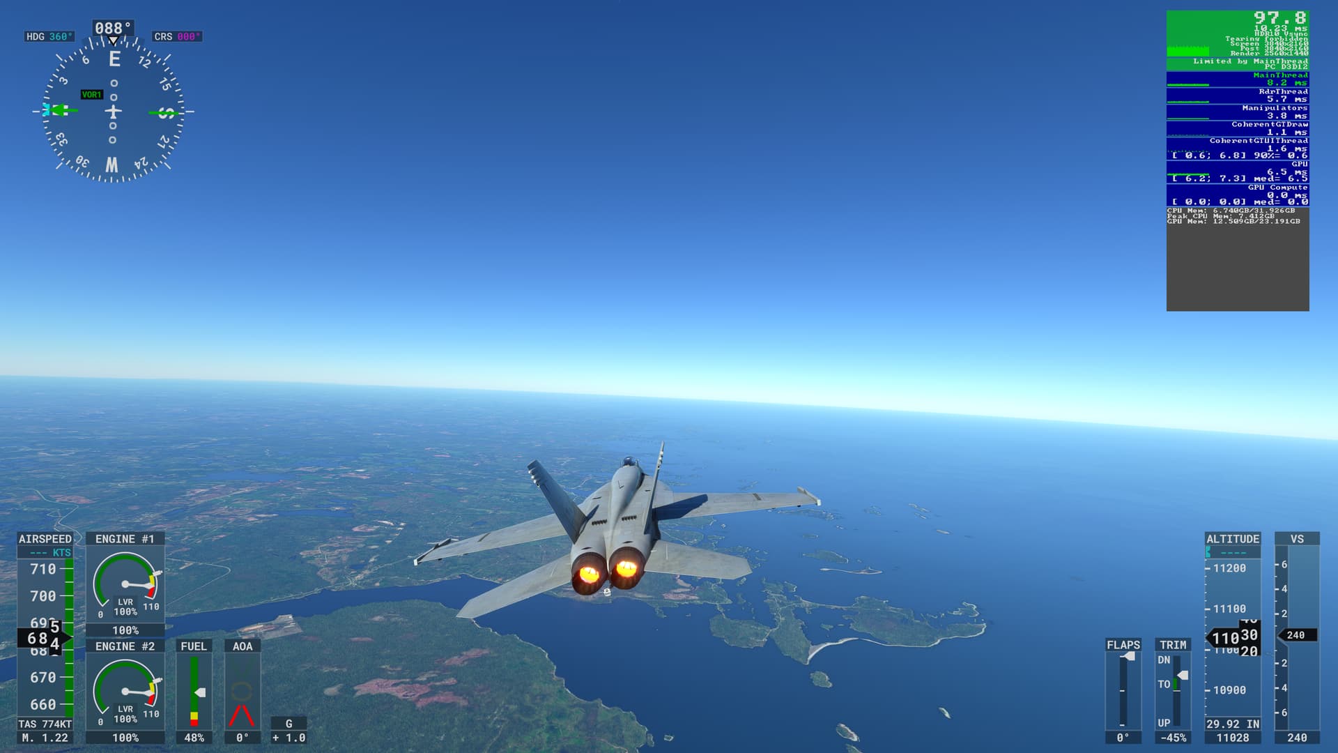 . FSR2 merely reduces the resolution the sim needs to feed the GPU and then upscales it to your monitors native resolution. So in the screenshot below with FSR2, it only requires 2560x1440 from the sim and then the GPU upscales it to 4k (btw I also have HDR10 turned on and vsync in the sim capped at 100fps). The CPU works less as there are not as many pixels it needs to feed the GPU. I believe that FSR2 is the equivalent to Nvidia’s DLSS 2.
