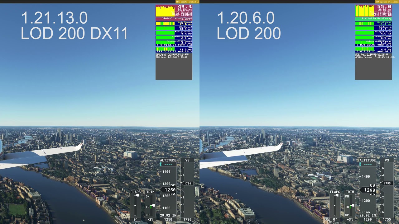 LOD 200/200, rendering at 2560c1440, render scaling 100, offscreen cache ultra, all else ultra other than motion blur and lense correction which are both off. Both version have Orbx London Landmarks and Orbx London City installed.