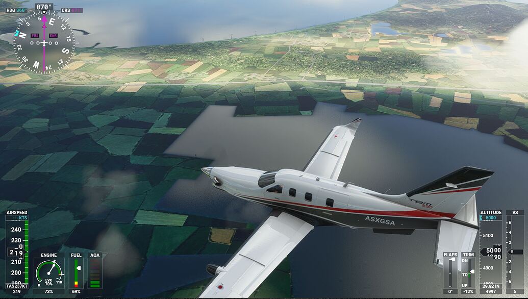 Trees look better, objects were good. Didnt have to fiddle with my controls. In flight, used the Garmin to select an airport, and loaded an ifr procedure. Worked as expected, AP roll, pitch, hdg modes worked. Nav mode captured the new plan. Turned ap off to land by hand at a local airport, soft field approach, full flap landing… plane did not slow or balloon as expected , and brakes were almost non existent ( even w full application ) on rollout.