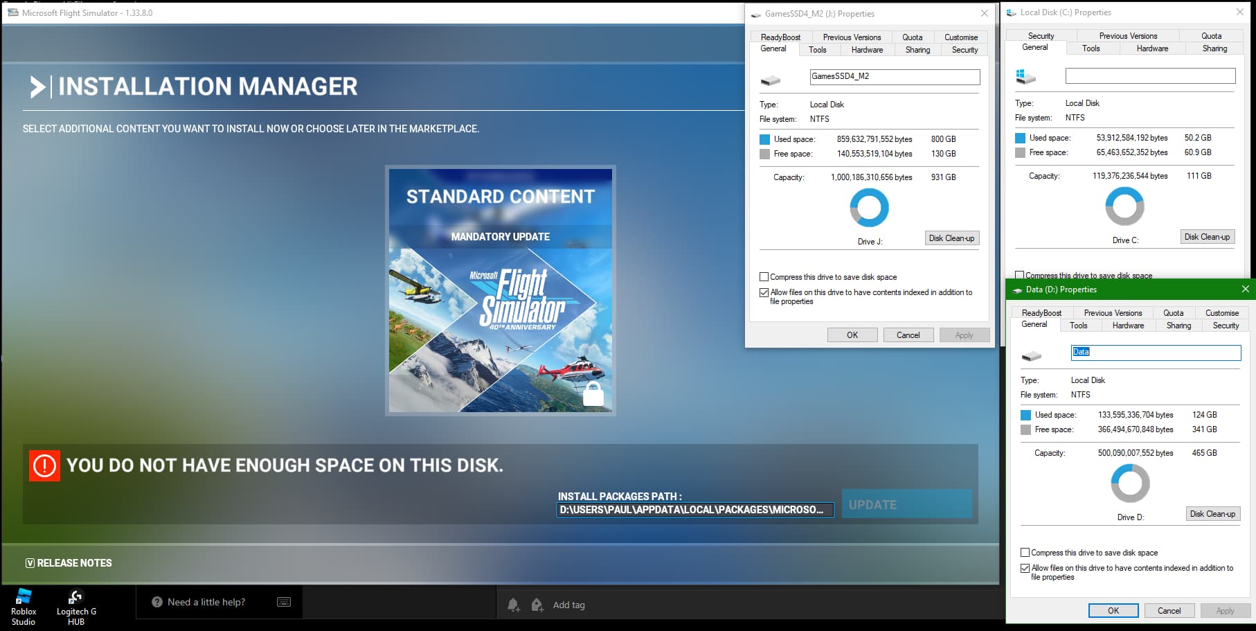 Why is Windows forcing consumption of C (i presume, as this is the only disk that could possibly trigger the error) when MSFS is installed on J and my user folder is on D?
