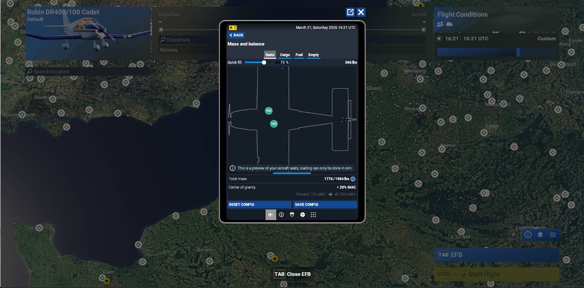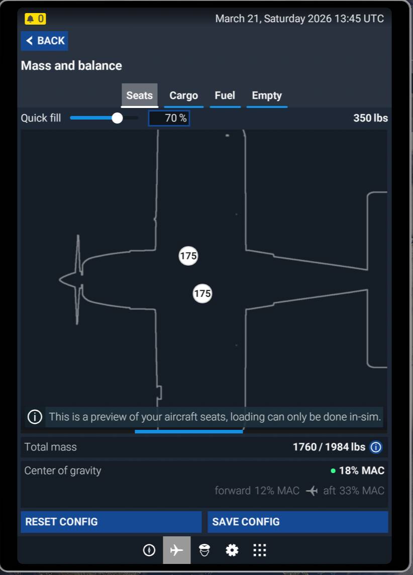 Observe the mass and balance menu once loaded into a flight and see that the pilot position has disappeared