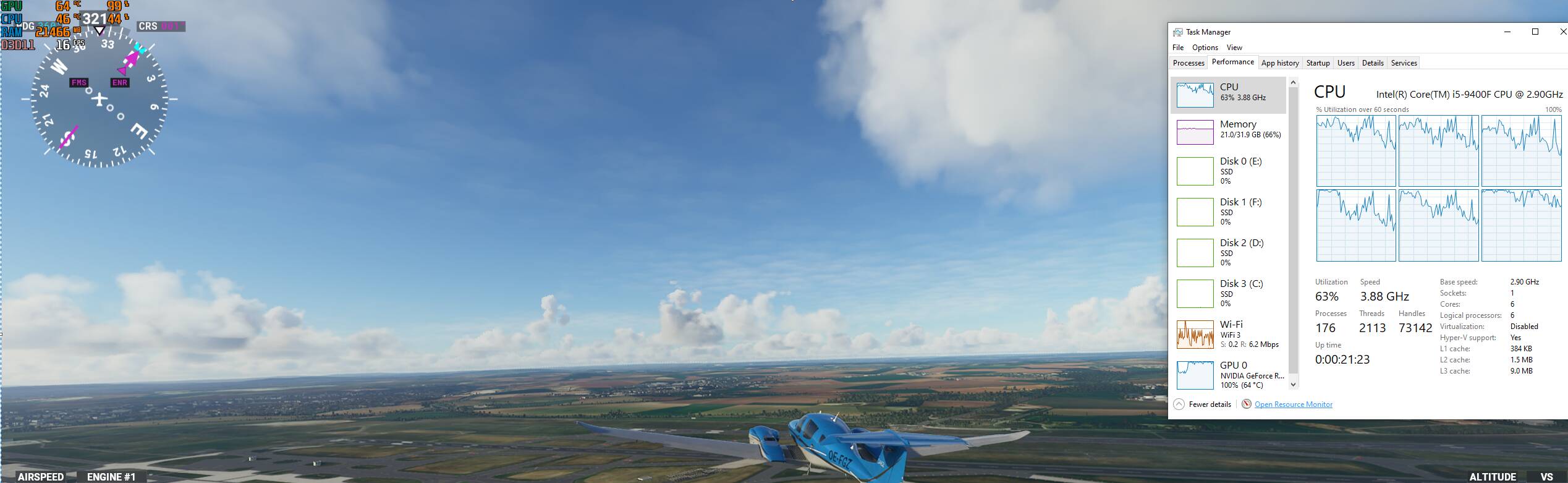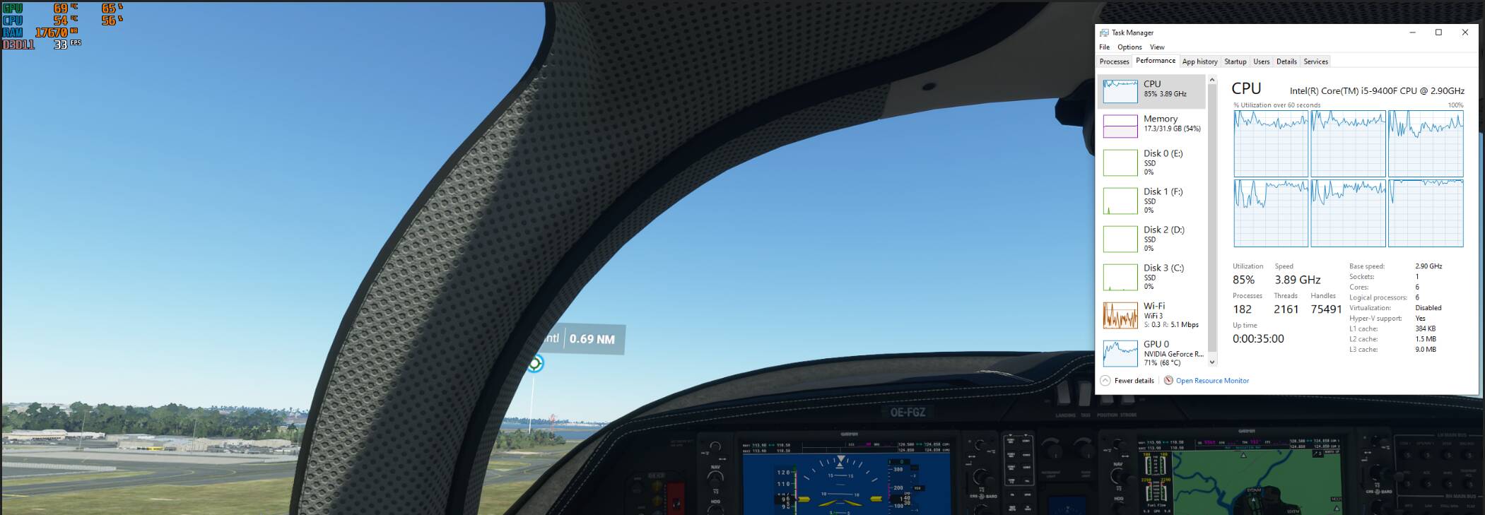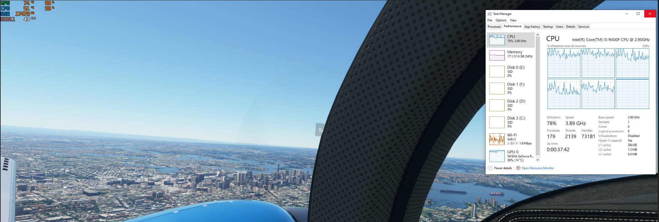 Sydney on takeoff- GPU 73%, overall CPU utilisation @ 85%, 1 core at 100% and the others 70% to 90%. So all cores working harder in an immediate airport area.