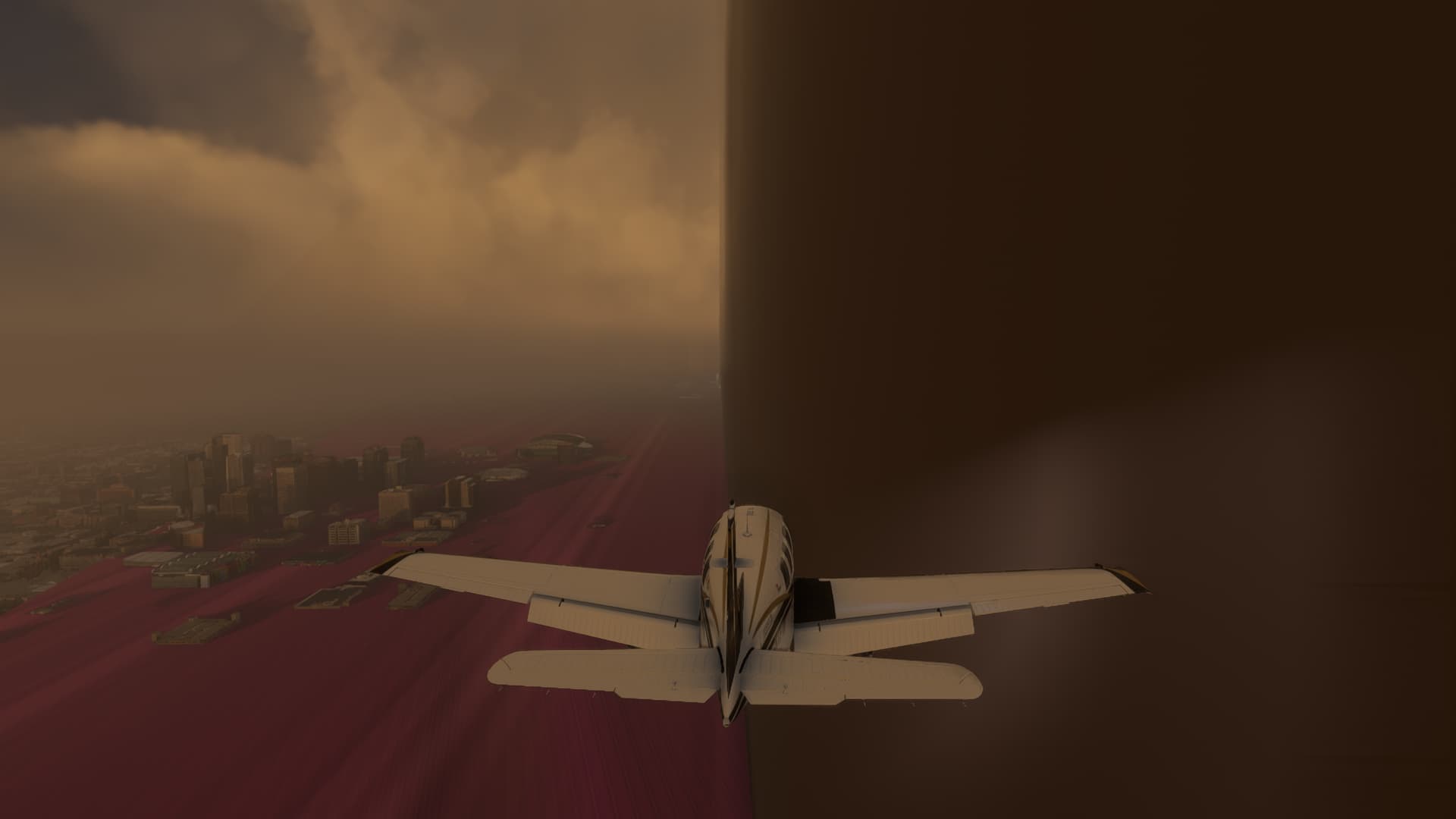 Similar experience to many other folk. DX12, dev mode off, no DLSS, traffic is on (AIG), LOD 300, photgrametry on, occurences are very unpredictable and effects can disappear. I’ve had some apparently related to flashing beacons. This shot over London with