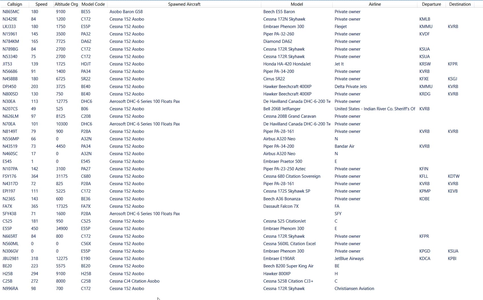 That model injected by ELT, is showing without cockpit/interior, so i will not get too many FPS. I did just spawn lots of C152´s around Florida flying low alititudes from FR24 data. But i am still getting some airliners to the airports, so i need to add airliners to that modelmatching file and make then invisible with invisible model. I think it can be done with 3rd party addon aircraft´s model.cfg.