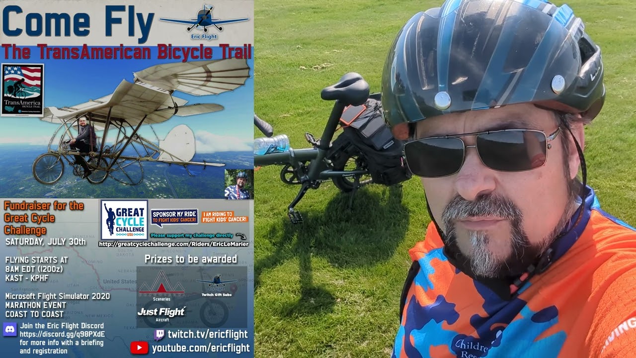 The Eric Flight Fly The Transcontinental Bicycle Trail Marathon will be delayed to August as I will be travelling to Dallas on July 23rd to get what I need to get done down there for my brother after his recent death. I will give more information in a couple of days. It will not be cancelled only postponed. More info will be posted on my Discord Server here: Eric Flight as I get a new date