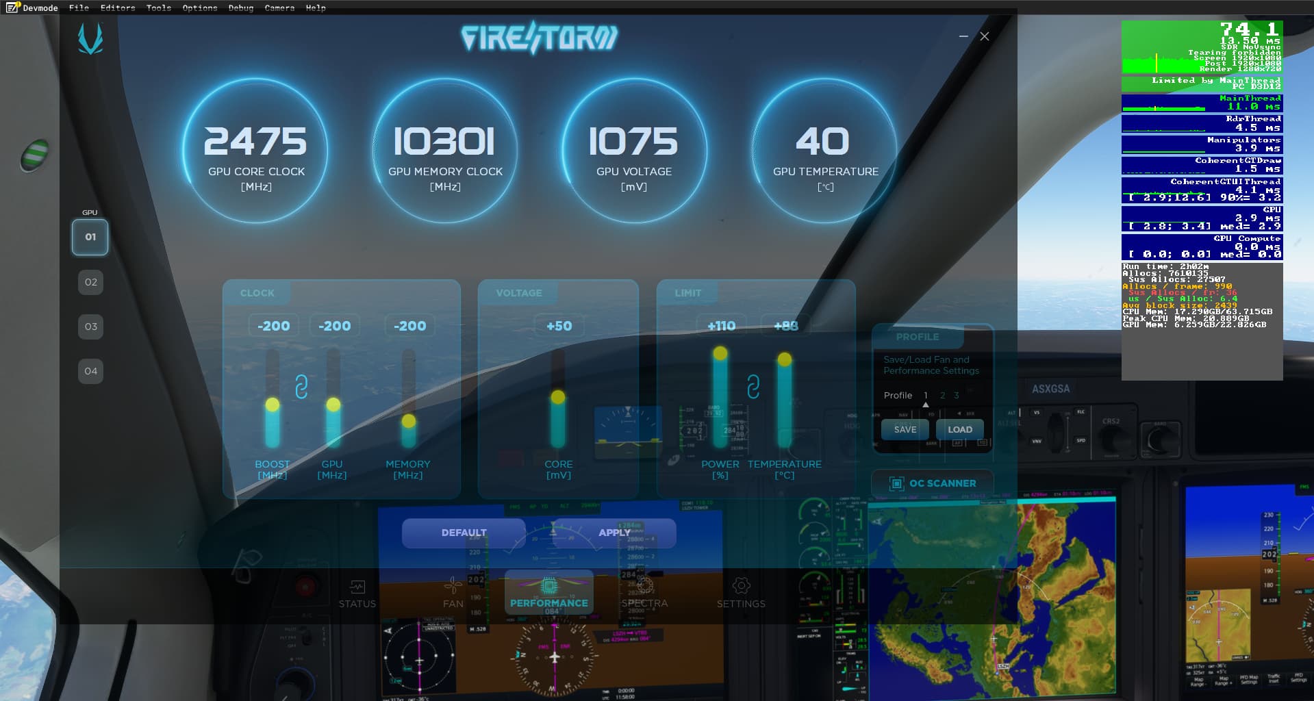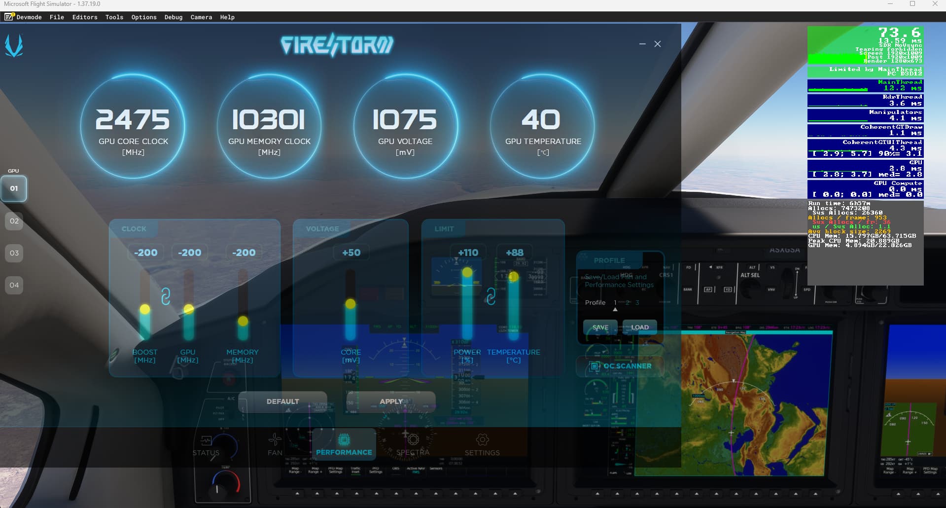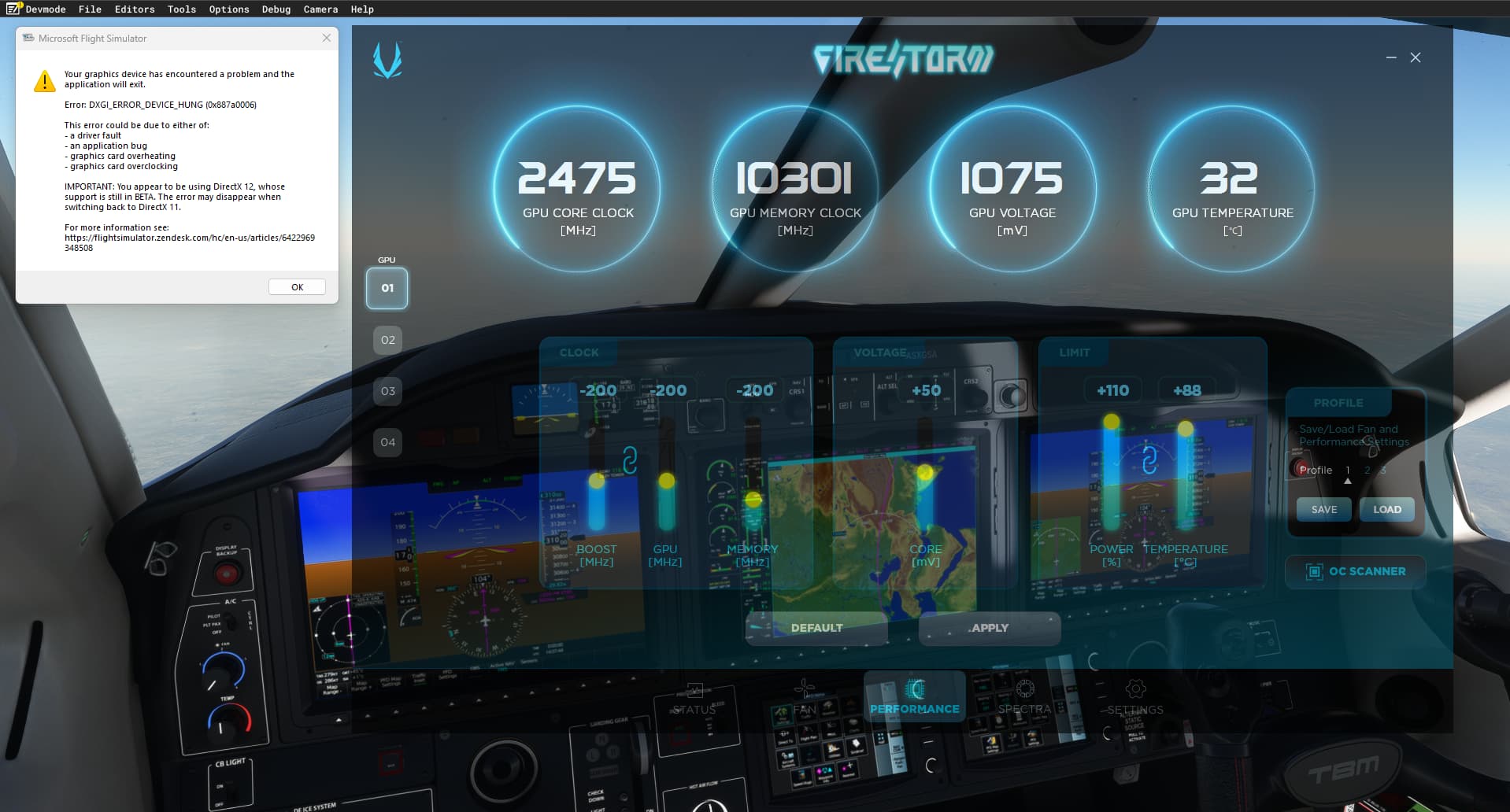 EDIT running at -200mhz. No more error, a 7 hours flight is undergoing… (zurich to phuket in the “slow” tbm with unlimited fuel). I have taken back up the frequency to 2535mhz so I have set -125mhz in zotac firestom for my 4090 trinity oc. It seems ok as well so far. I set back to 0 the memory. It looked as if it was running at 27% of the load so it felt normal to set memory back to 0.