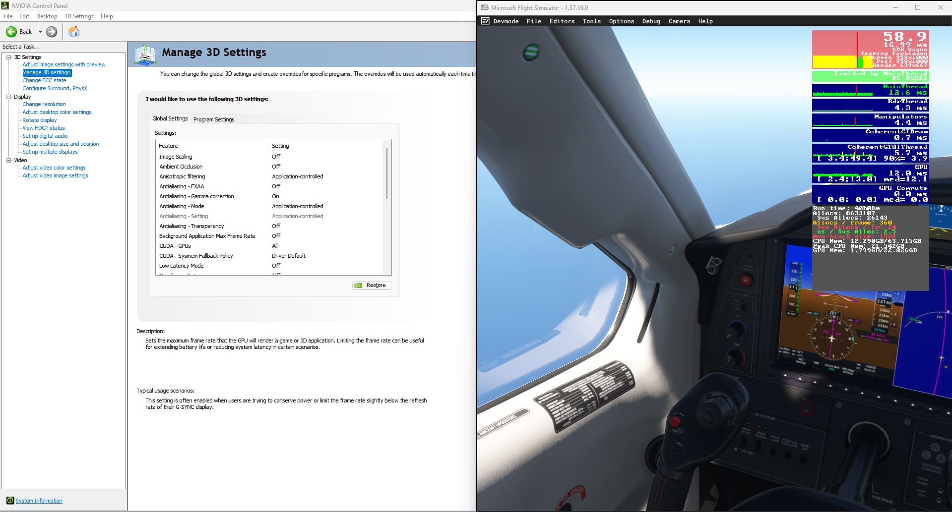 EDIT ; UPDATED TO LAST DRIVER, RESET SETTINGS TO DEFAULT so no minus 200. I clicked on debug mode in nvidia control panel so it is checked. I ran the game at x16 mode and it made the flight from Zurich to bangkok (don’t ask me why this flight, i have no idea)