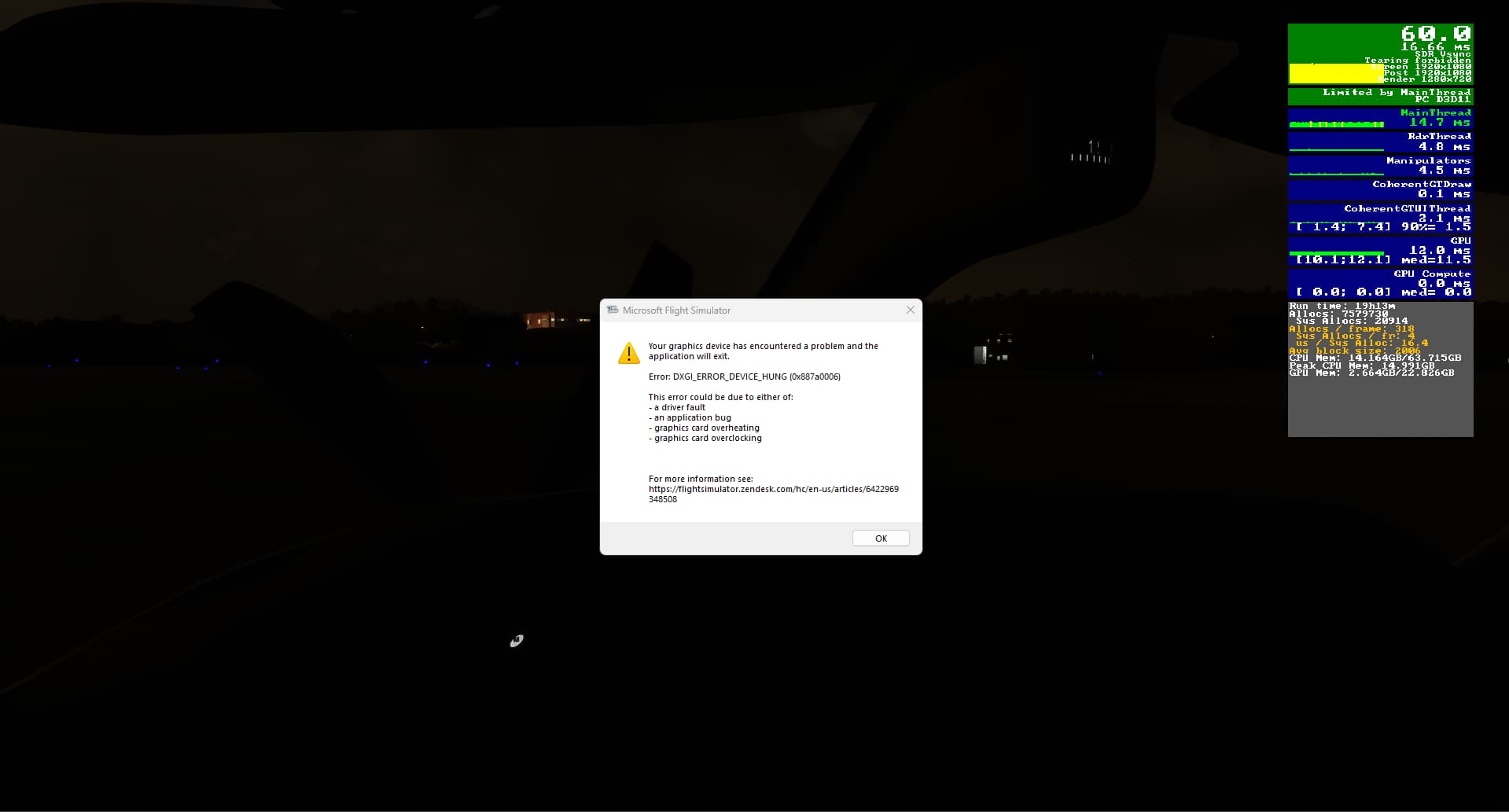 The game just crashed. MFS window is frozen and the game won’t disappear until i click ok on that window so I brought up Nvidia control panel, GPU driver is set to maximum performance for power → so that didn’t solve the issue.RIVETUINER shows that the temperature was at 41 degrees celcius at time of crash which is a 36% GPU load, frequency was 2618Mhz and fans were running at 36% which looks more than fine to me. No other task running in background.