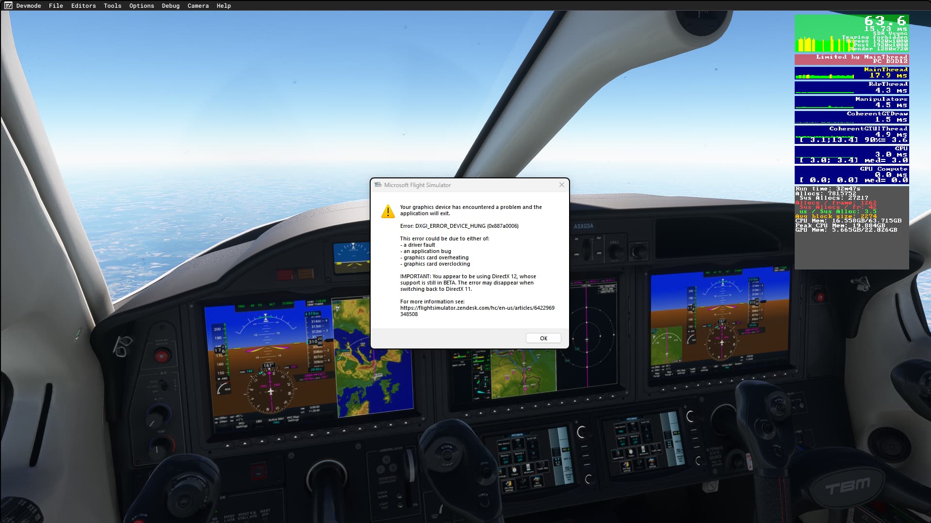 Lowered all frequencies by 200. Took off from zueich with tbm930 with unlimited fuel, i am now ovwr syria on eay to dubai and no crash. Lets see what happens tomorrow morning.