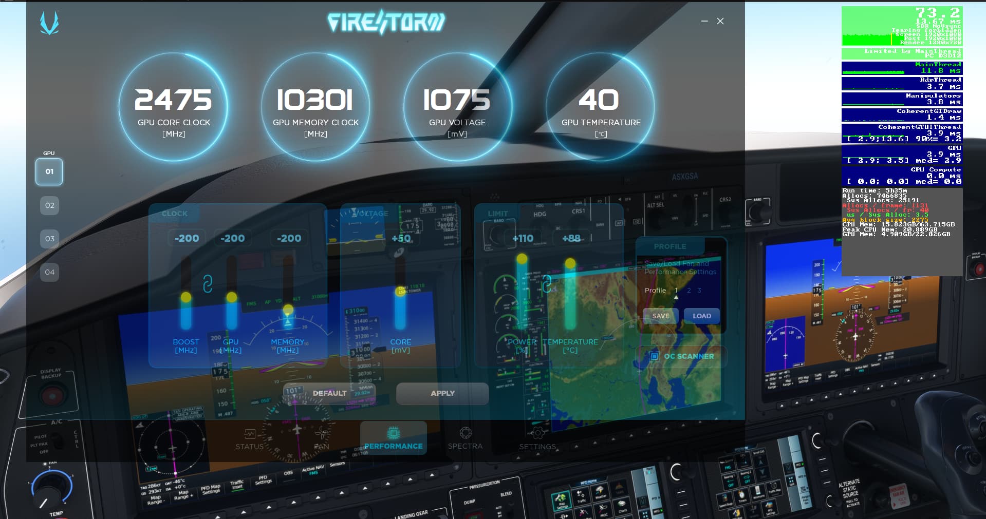 Another thing I’ll change is turning off GPU control settings in MSI FIRESTORM to make sure Zotac and MSI utilities are not fighting one another (i doubt it, FIRESTORM updates automatically its settings as soon as ZOTAC firestorm is edited). EDIT : I had turned off MSI AFTERBRUNER monitoring right after last crash and turning it back on (at least ticking the monitoring checkbox in settings crashed mfs * was also trying to activate rivatuner layer at time of MFS2020 crash)