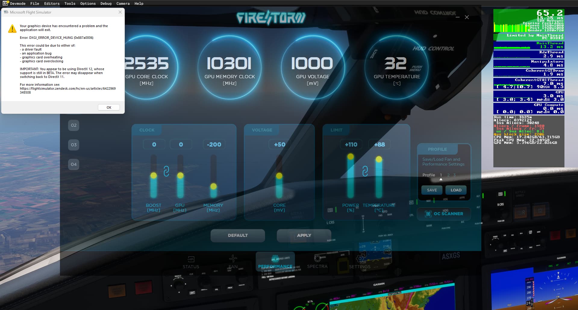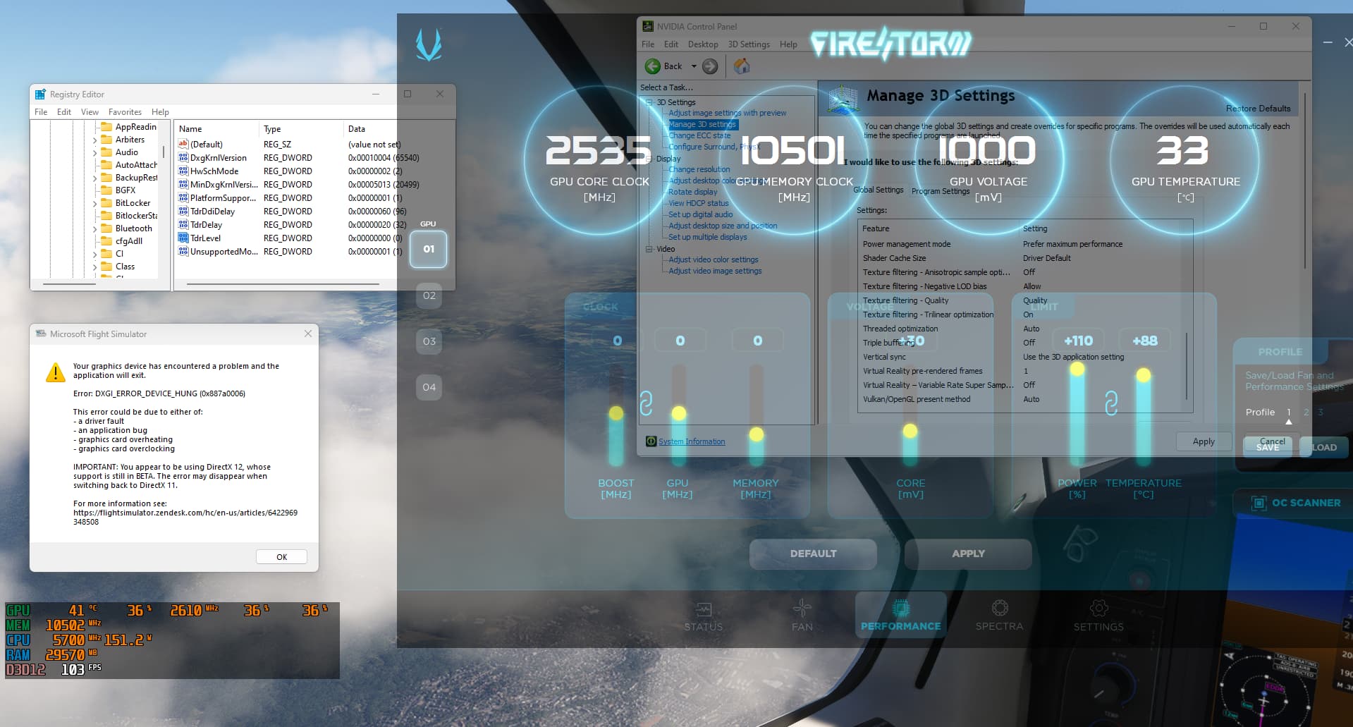EDIT With all at -200… including MEMORY… so far so good no crash and very long flight already. Now, i need to add that i made another change, i uninstalled GEFORCE experience and also in nvidia control panel, i put all antialisaing settings i could see in general and program specific tabs to OFF since the games handle this themselves. It is to be noted I used directX12. If the device hung error comes back, I’ll try to set to Directx11. Once again, i want to say that another same GPU doesn’t have this issue so i’m still convinced this error is not software related 100% of the time (not everyone can test 4 same 4090) I’ll get to the bottom of this