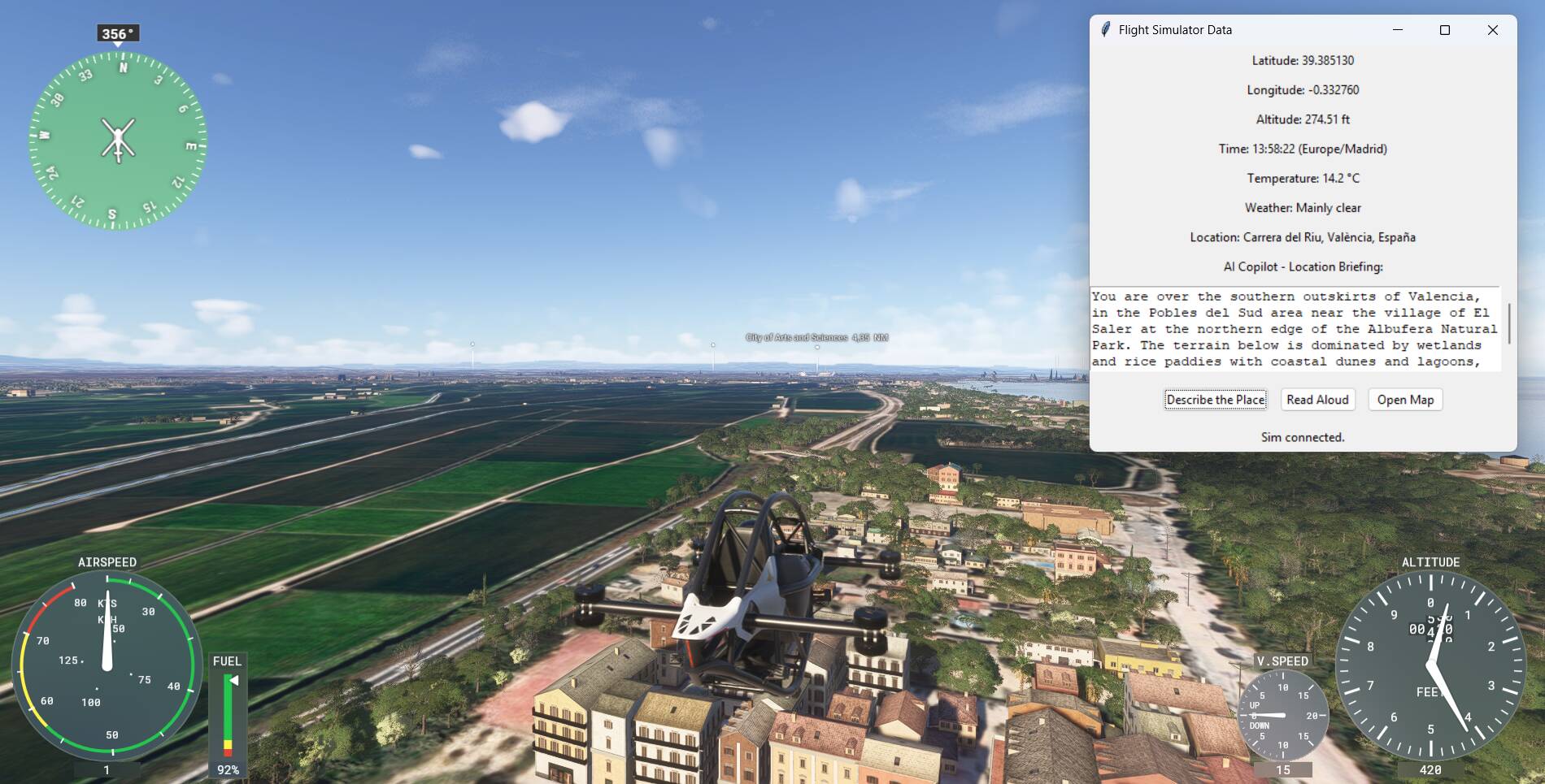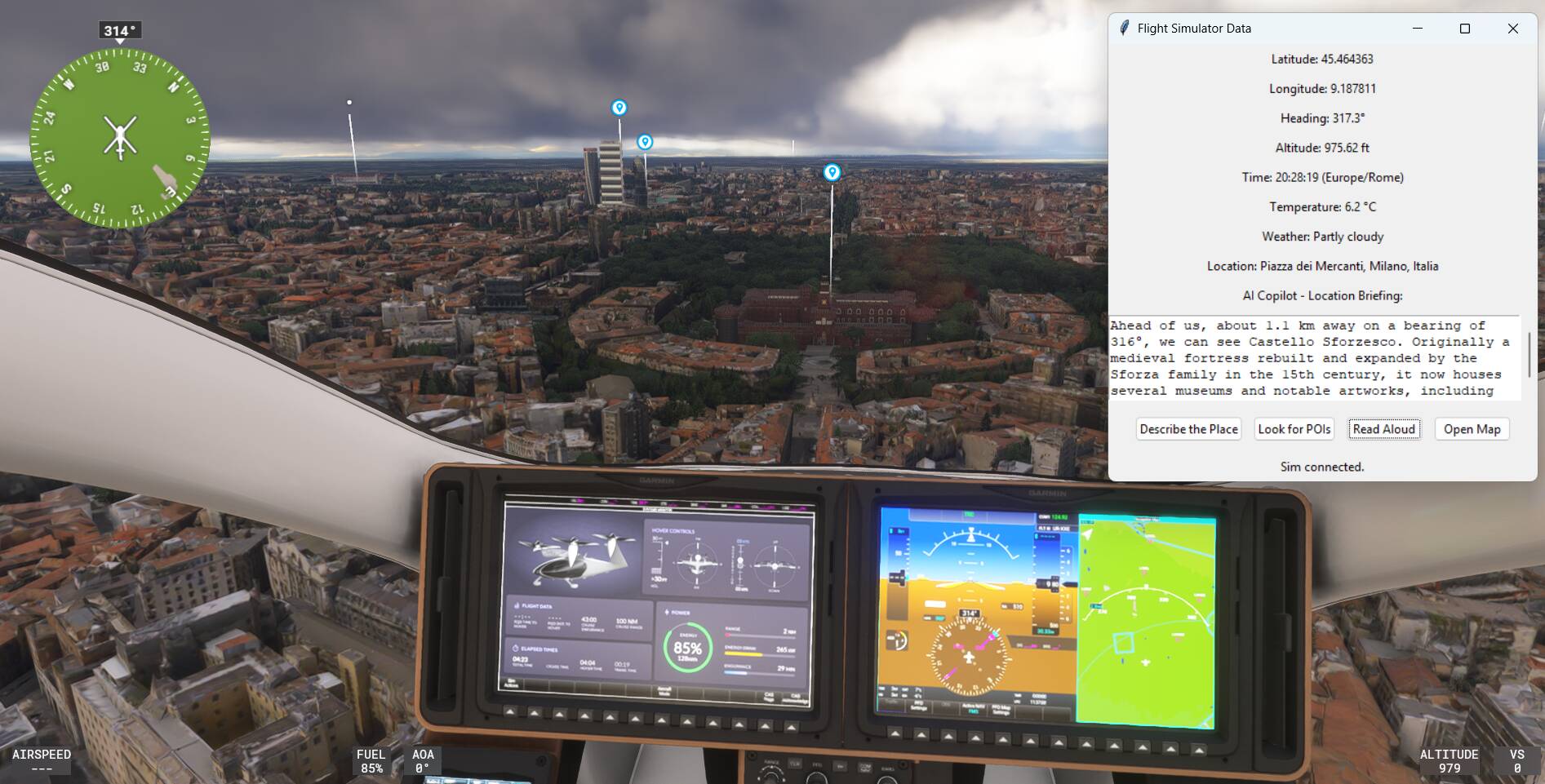 It’s interesting (and useful) to learn that there are already apps doing something similar. In my case, I’m very much a “virtual tourist” when I fly, and I felt the need for something that could provide lightweight, contextual information about where I am. That’s also why I wanted to experiment with SimConnect and LLMs in the first place.