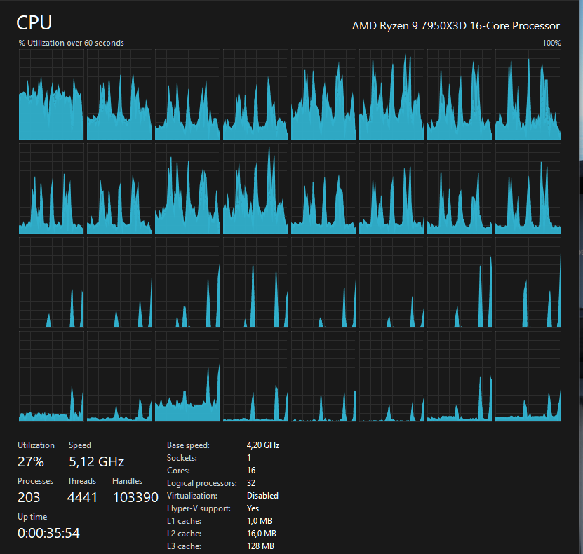 I removed the Germany World Update and a small Germany City update?! No changes unfortunately, when climbing through 28000 ft temps start increasing from 55 to 85 deg. Tmax is 89 for my CPU. You can clearly see the spikes from the task manager.