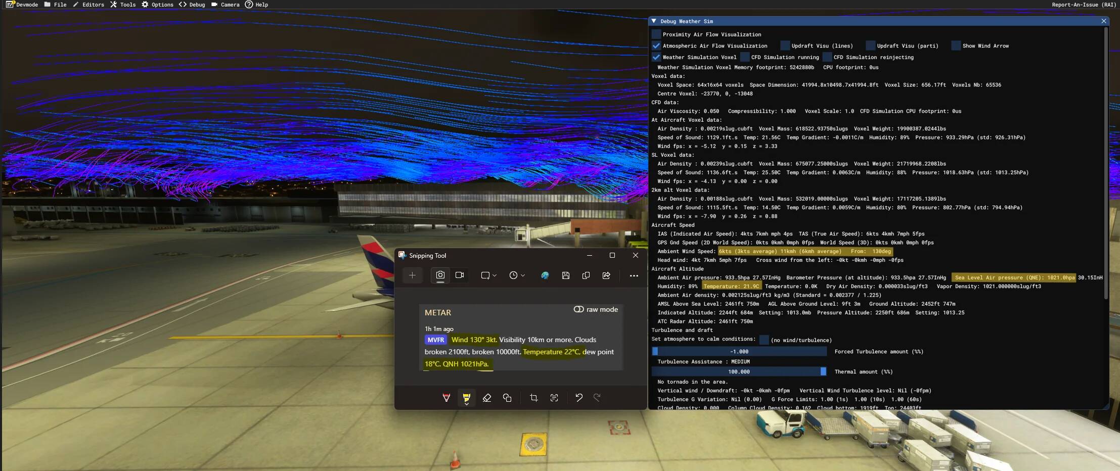 Screenshot shows the weather debug now showing correct live METAR info and the atmospheric visualizer showing smooth, stable wind lines, updating normally and on the right direction acording to metar. (not the case before the troubleshoot)