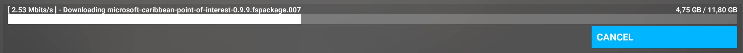 fspackage.007 has now been sitting at 3-4MBit/sec speed for itās whole duration now (30mins) it hasnāt as yet picked up speed. 5.47GB / 11.98GB downloaded 2 hrs in. This is becoming an all evening download for me here in UK. By calculation it should be a 53minute download at 30MBPS, an hour tops.