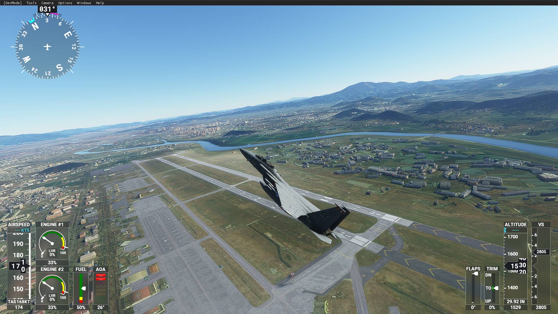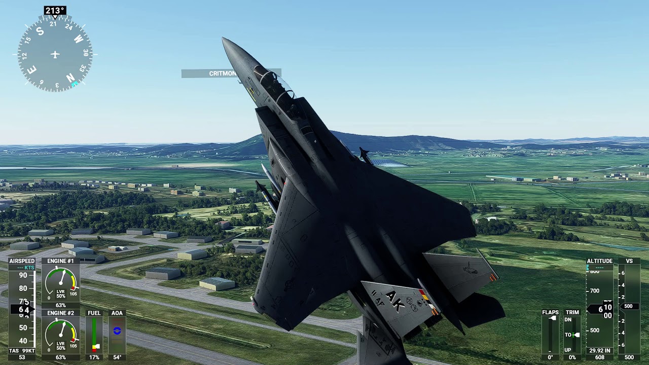 Actual F-15 have a two vertical tails and ARI (Aileron-Rudder Interconnect) and CAS (Control Augmentation System). However, I failed to simulate this additional control system, maybe MSFS2020 doesn’t support dual vertical tails and ARI / CAS system properly or I missed functions. Therefore, directional stability is little bit insufficient in specific condition like a high AOA (over 20 degrees) and low speed.