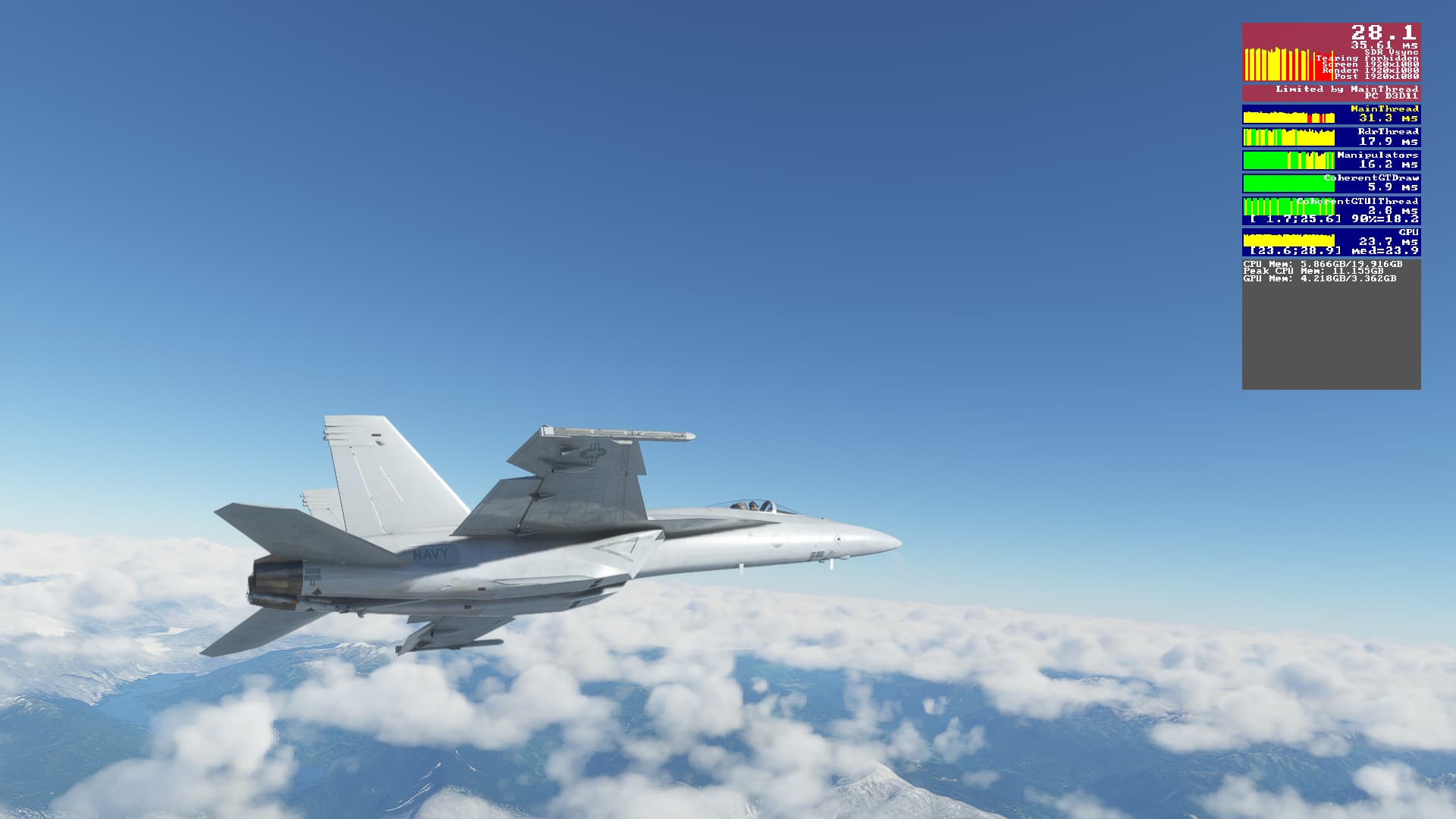 AMD System Ryzen 7 5800 and GTX 3080 graphics card. Massive FPS drops when F18 trails are kicking in. Basically unplayable…