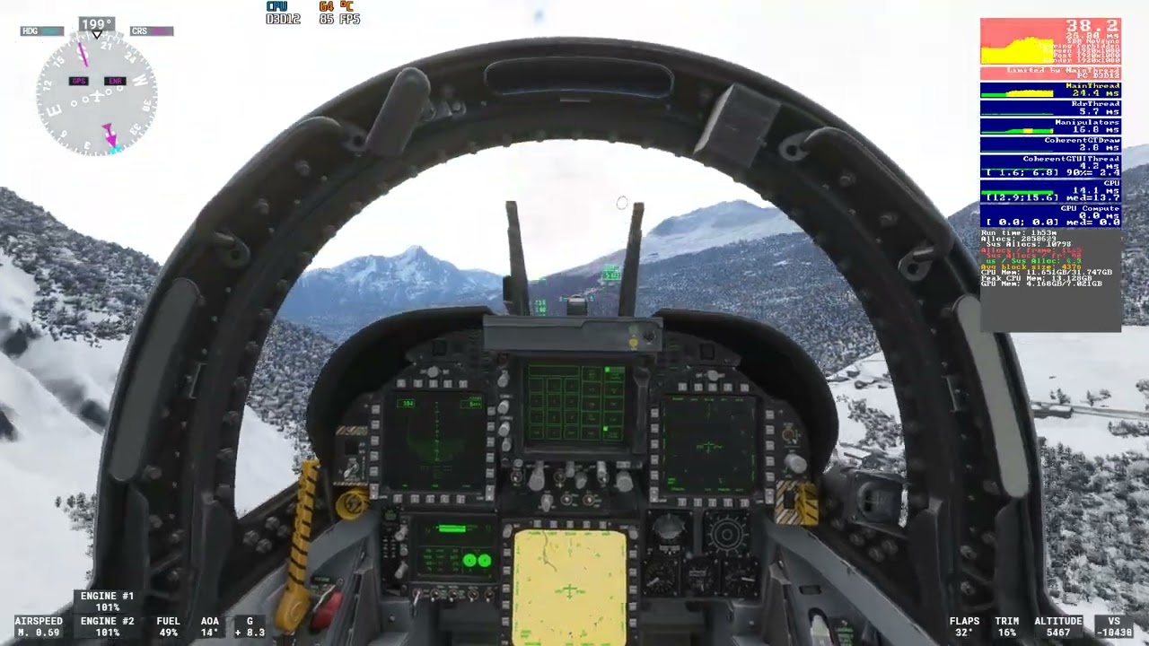 Whenever i fly the F/A-18 (doesnt matter if cockpit view or outside view) and the vapor trail effects happen on the wings i get massive fps drops. For example during chase camera i slow down to 300 knots and do a hard turn and the vapor effect start appearing on the wings my fps drops from 70 down to 30 and goes back up to 60-70 as soon as the effect dissipates.