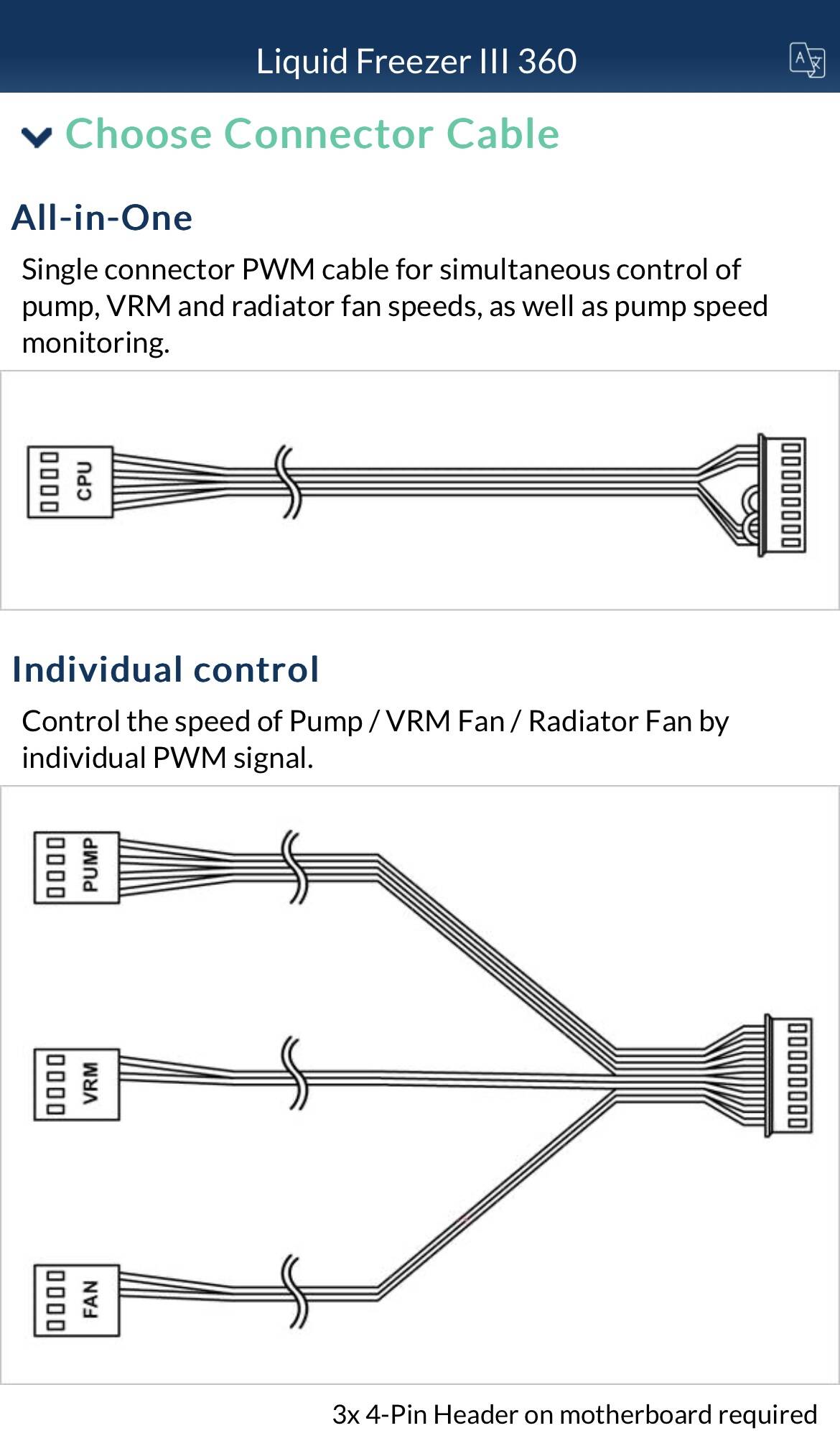 The artic AIO comes with two cables to choose from. All in one cable which is labelled CPU on the connector. I think this must connect on the MB block where it says cpu fan1?