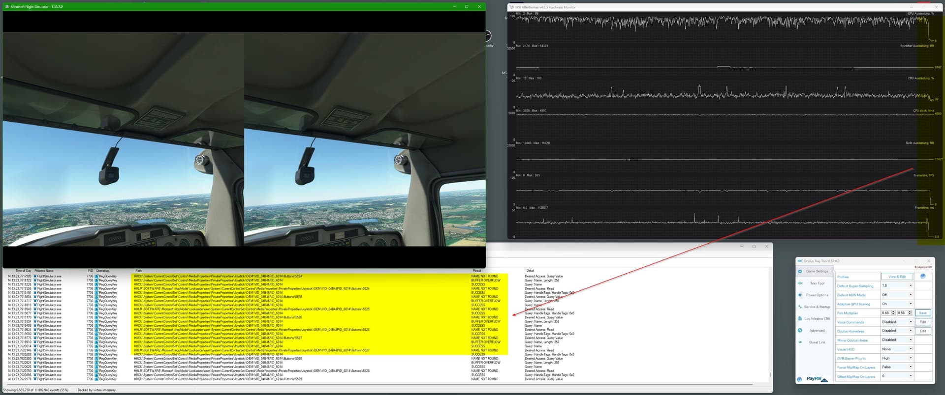Problem: During a flight, or even on the ground. If after approx. 5-15 minutes (cannot be determined by an event) the flight simulator.exe freezes for approx. 500-2000ms. The reason is an extreme access to the registry where the flugsimulator.exe tries to read up to 5000 buttons of the mouse, keybord and other devices. I have logged this with procmon64 and can also clearly assign this via video and Afterburner graphs.