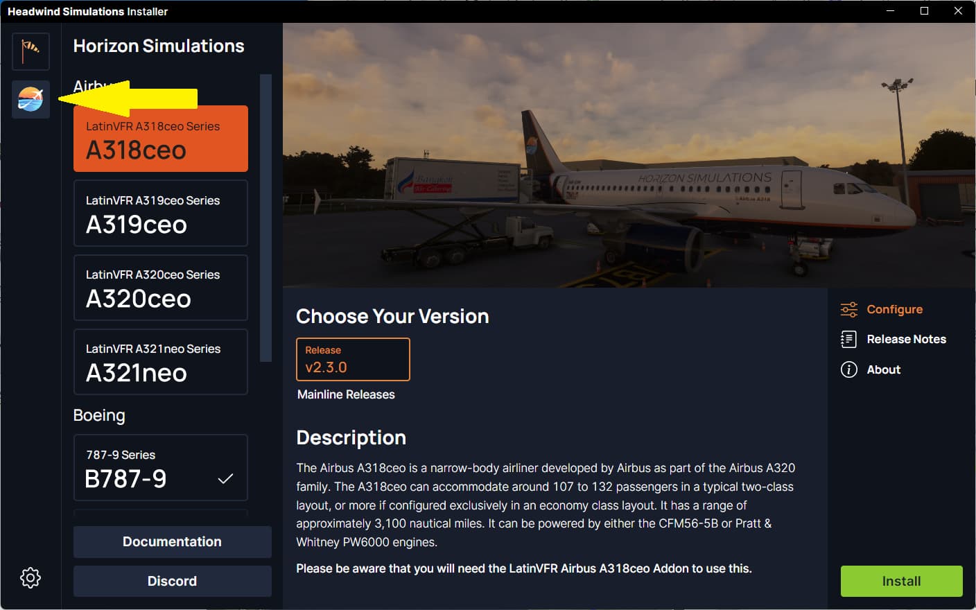 I installed it, but it shows only Airbus A339 and A338. But can’t find Horizon Sim Boeing 787-9. Could you please help me to loacate that?