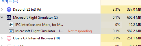 Same here. Only time MSFS quits without having it to kill in the Task Manager is when no other tool is running with it. In my case it was Fenix and FSUIPC – quits without either of them, but when one of them is installed, it just hangs at “not responding”. This is a clean Windows 10 and sim install from two weeks ago, it was running fine with both of these tools (and many more for that matter) before.