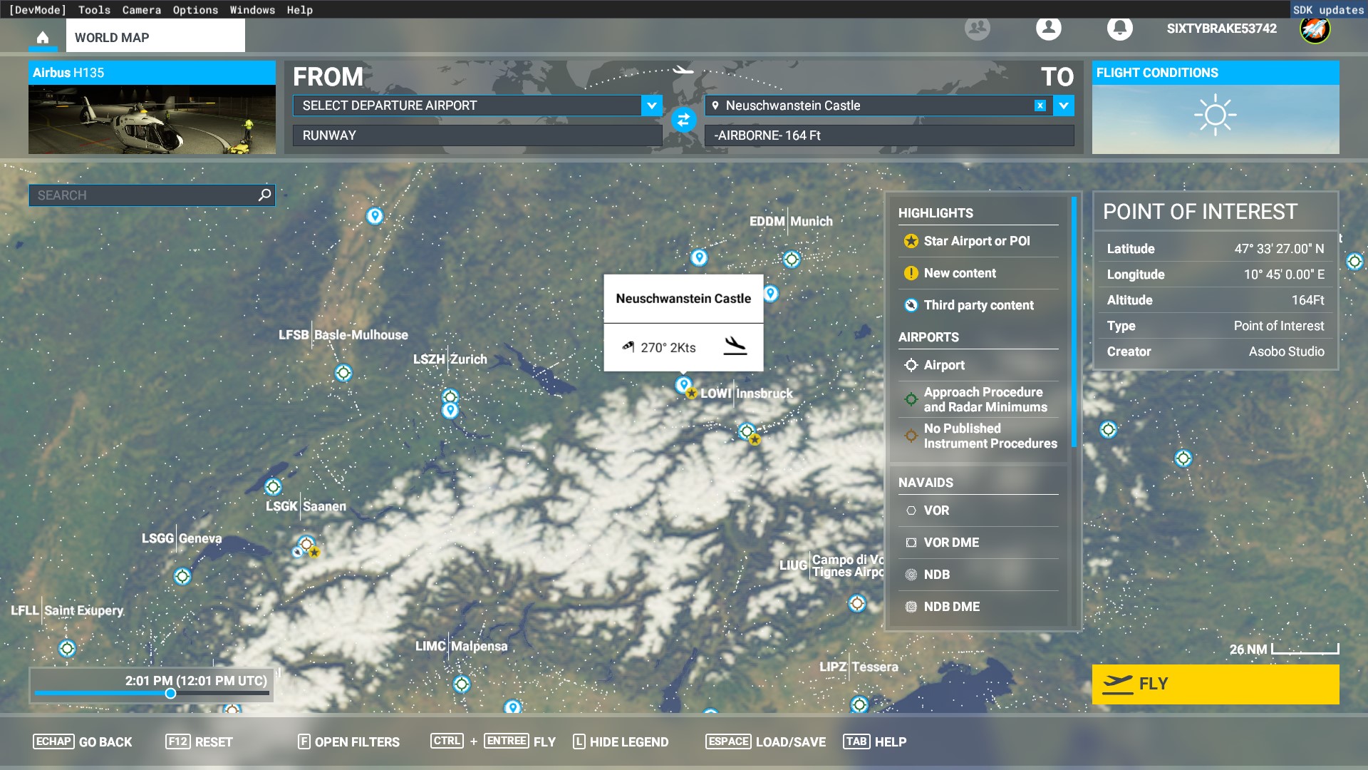 In the case of POI there is no need for starting from an airport and the “Fly” button allows to begin the flight. As it can be seen on custom_2 this button is not active.