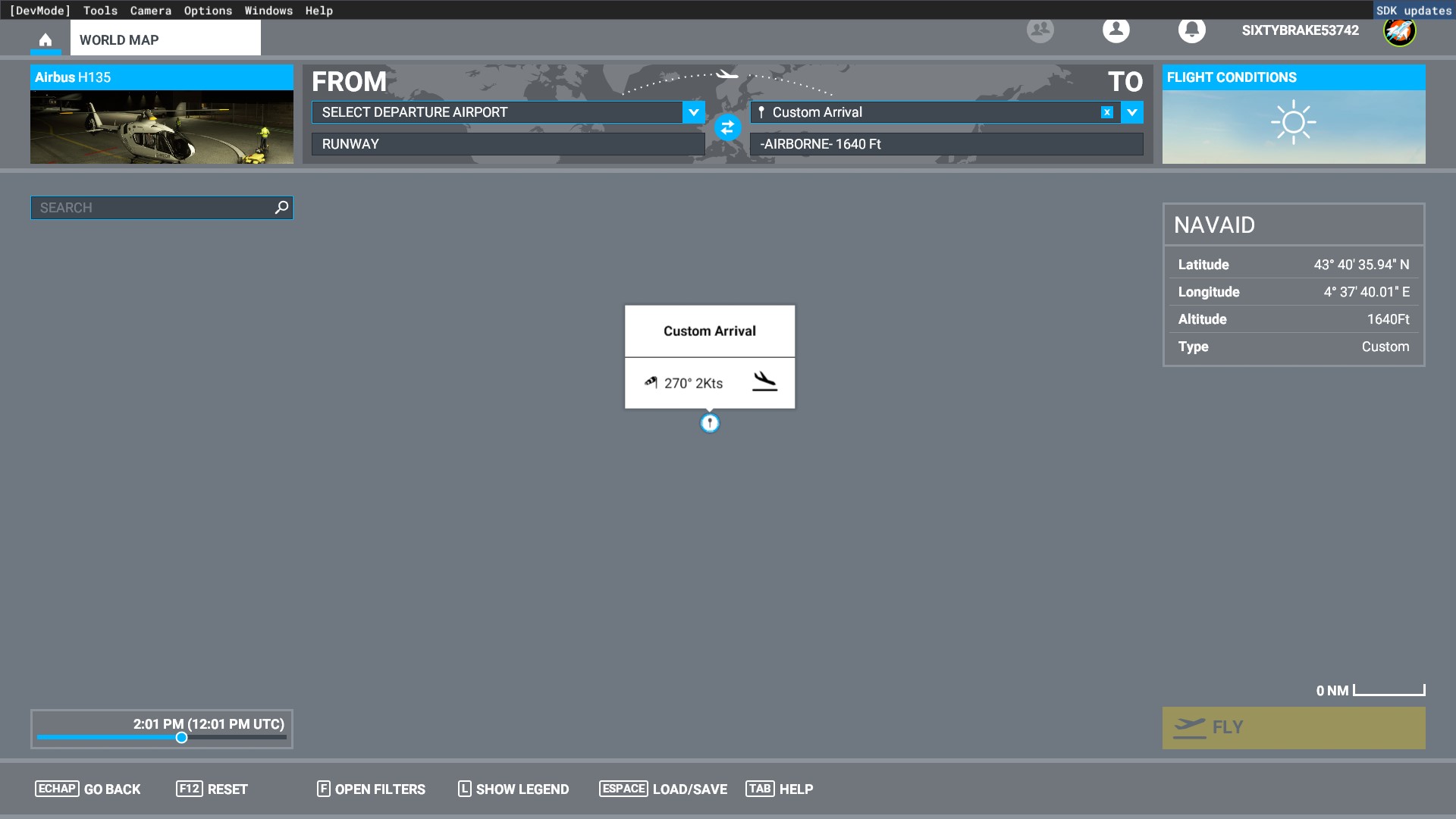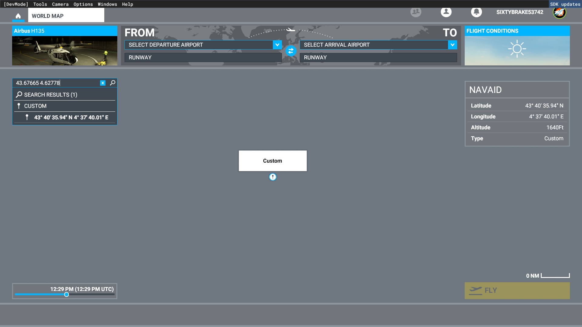 Even if the choice of a custom location via GPS coordinates is possible it seems not possible to continue the flight. After having selected “set as arrival” the “Fly Now” field cannot be activated. This is possible if a name is associated with these custom coordinates. I have not found how to define such a name.