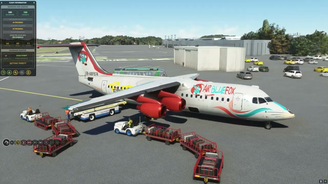 Flying with the BAE146-300 with self loading cargo Full Flight in french
