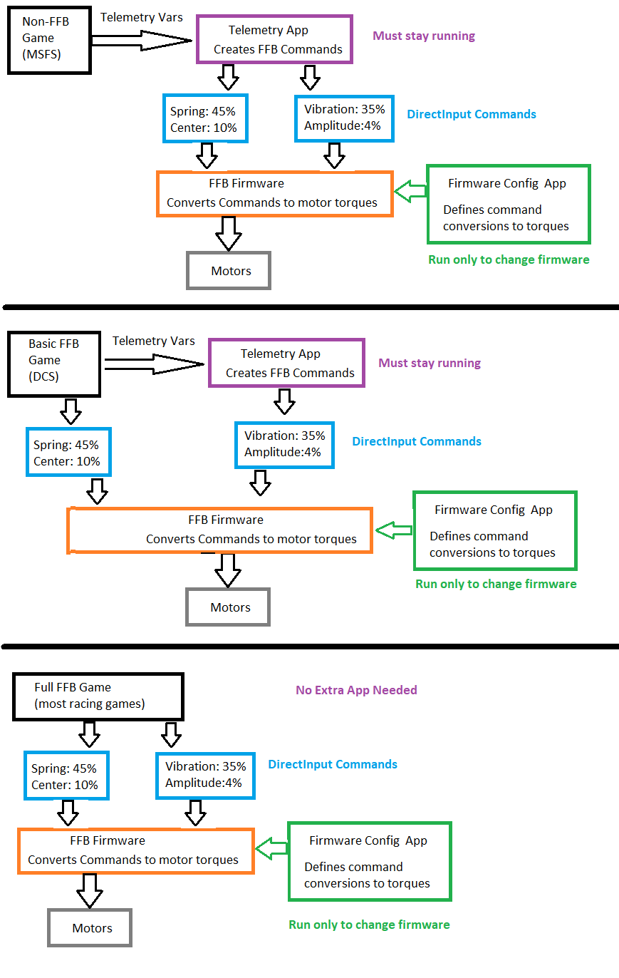 Force Feedback software tell the FFB hardware how much force there is on the control surfaces. In planes thatās the ailerons and elevator, in cars its the steering gear. For games that support it like DCS or most racing games, its possible to not have any external software, as the game sends the standard DirectInput API commands to it.