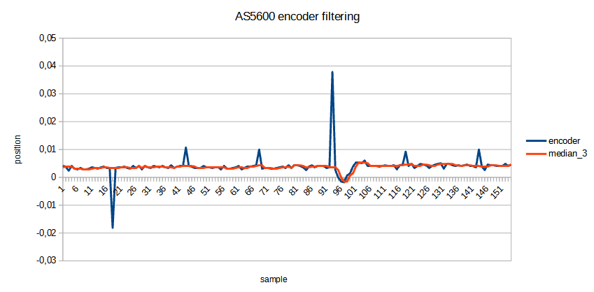 One little thing I can fix very quickly is my shaft position encoder response. Currently, Iām using 12-bit AS5600 encoder, which gives me a kind of popcorn noise (random peaks). This translates to a kind of restless yoke behavior. A simple median filter (size of 3 is enough) eliminates this noise: