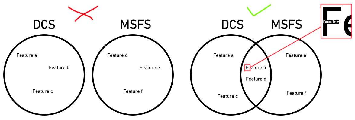 By the way I think it is a great thing that MSFS is not as hard to get into as DCS, I said it already in another topic when talking about cyclic mapping being more oriented towards short/ standard joysticks and not fully sized controls. What I am saying is I would expect MSFS to give me an OPTION to make it as realistic as DCS (or more) in those areas mentioned. Tldr; yes, those are different products, but there are similarities and saying that MSFS is not DCS is not an argument for “DCS is niche, so MSFS can’t be compared to it”. It would be if I said I want MSFS to model AA / AG radars for example. Different sims doesn’t mean different expectations in basic areas like FM, or Force Trim functioning IMHO.