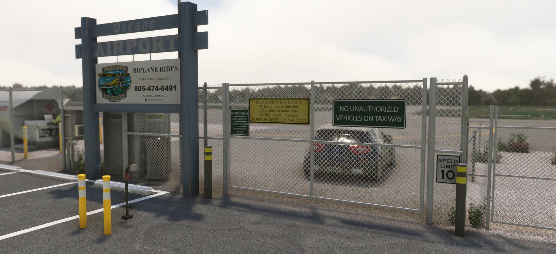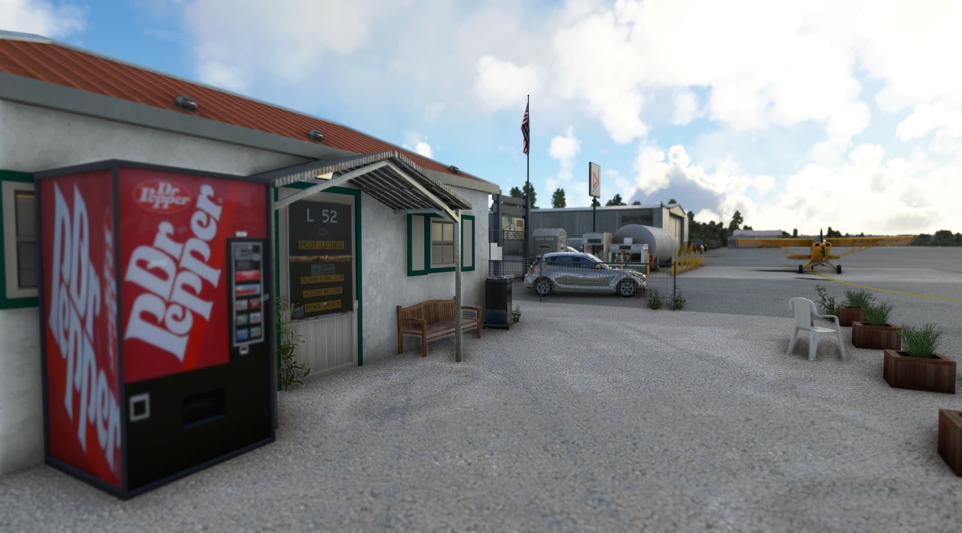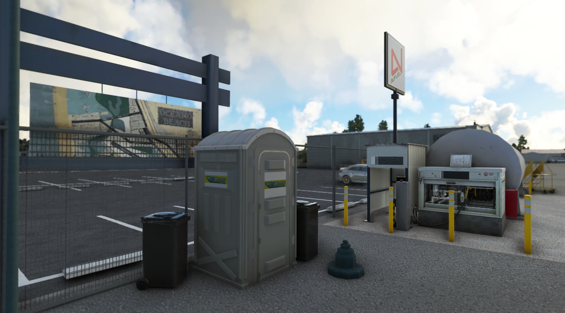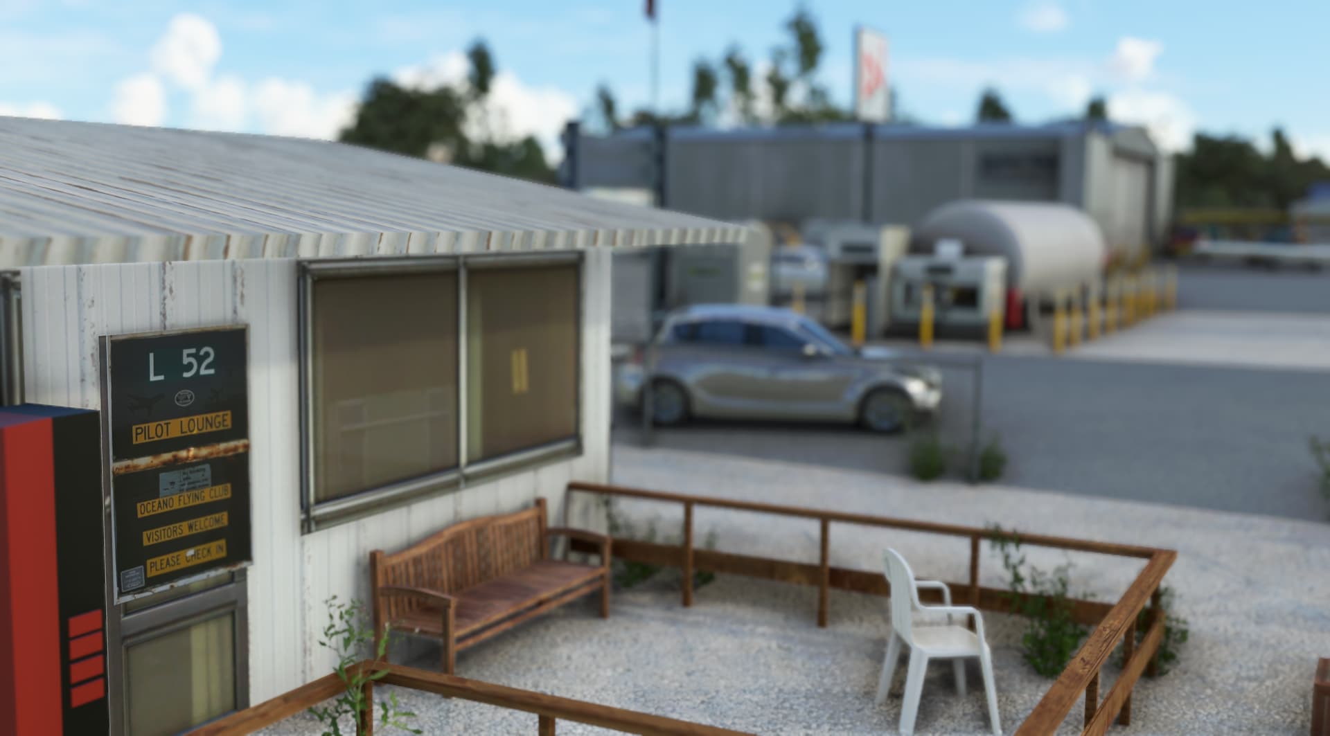 All airport buildings have been replaced: airport office and its pilot lounge, main entry gate and his numerous signs, fuel island, executive hangar, airport beacon, wind cone and segmented circle (WIP)… not to mention the famous campground. The scenery is available for free at https://flightsim.to/d/vbazillio/l52-oceano