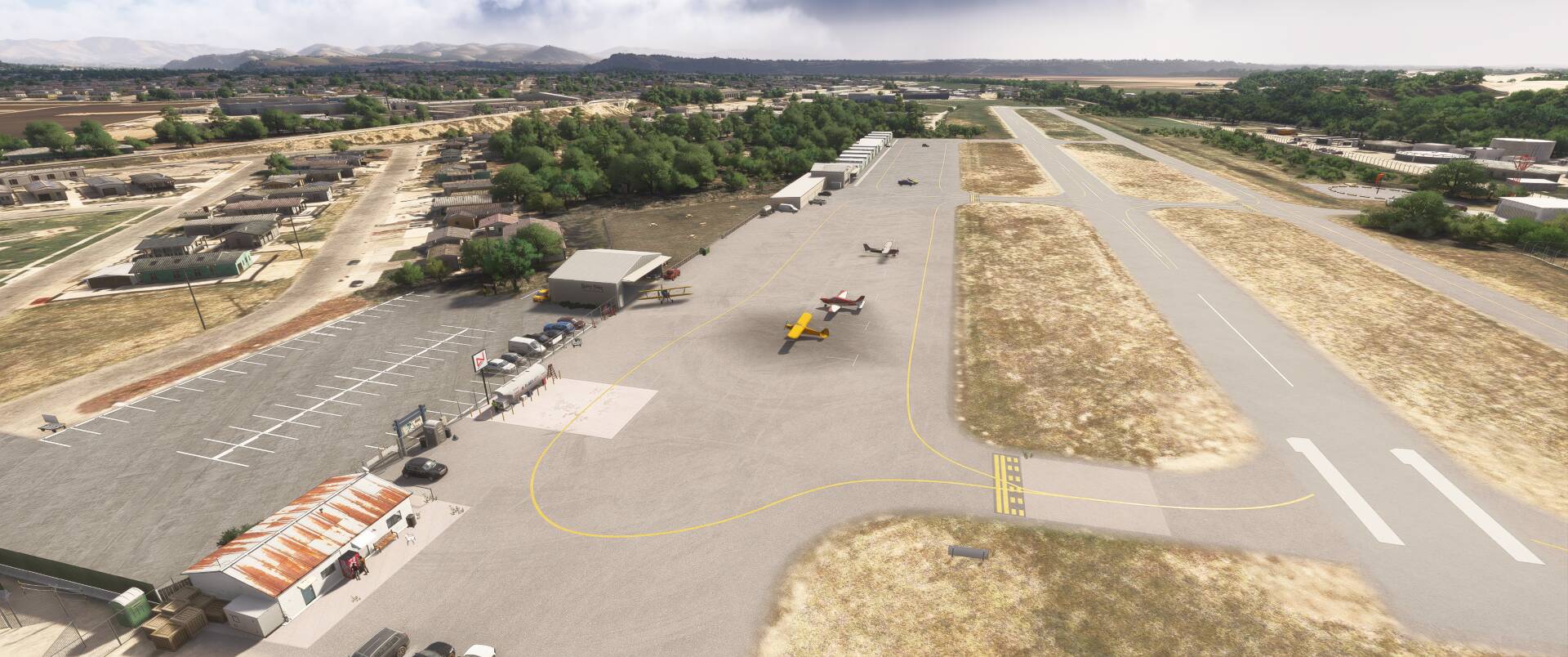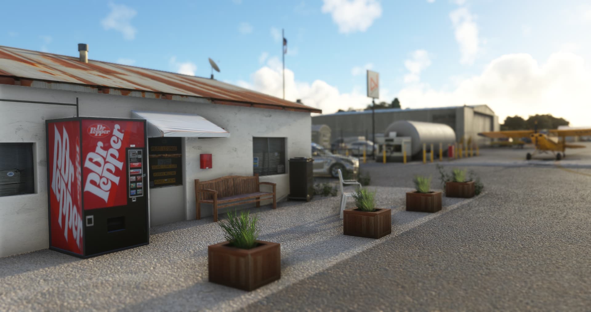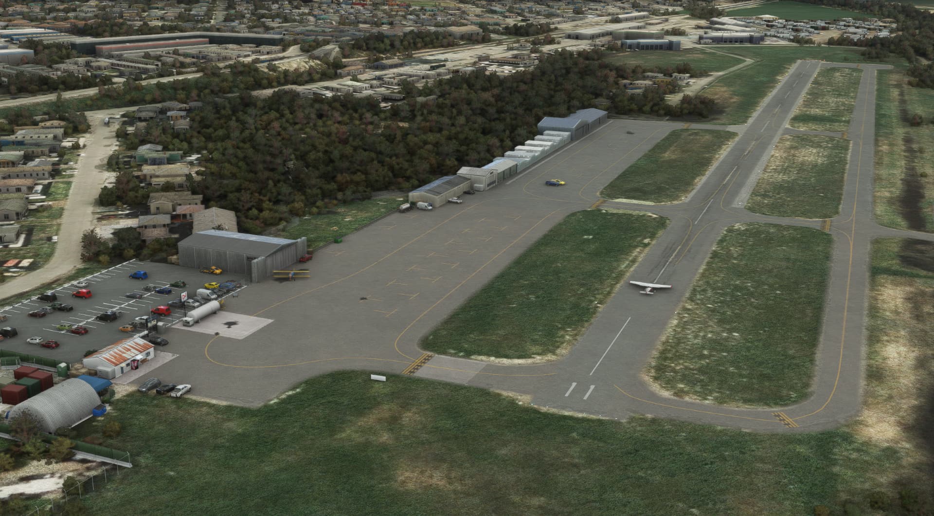 All airport buildings have been replaced: airport office and its pilot lounge, main entry gate and his numerous signs, fuel island, executive hangar, airport beacon, wind cone and segmented circle (WIP)… not to mention the famous campground. The scenery is available for free at https://flightsim.to/d/vbazillio/l52-oceano