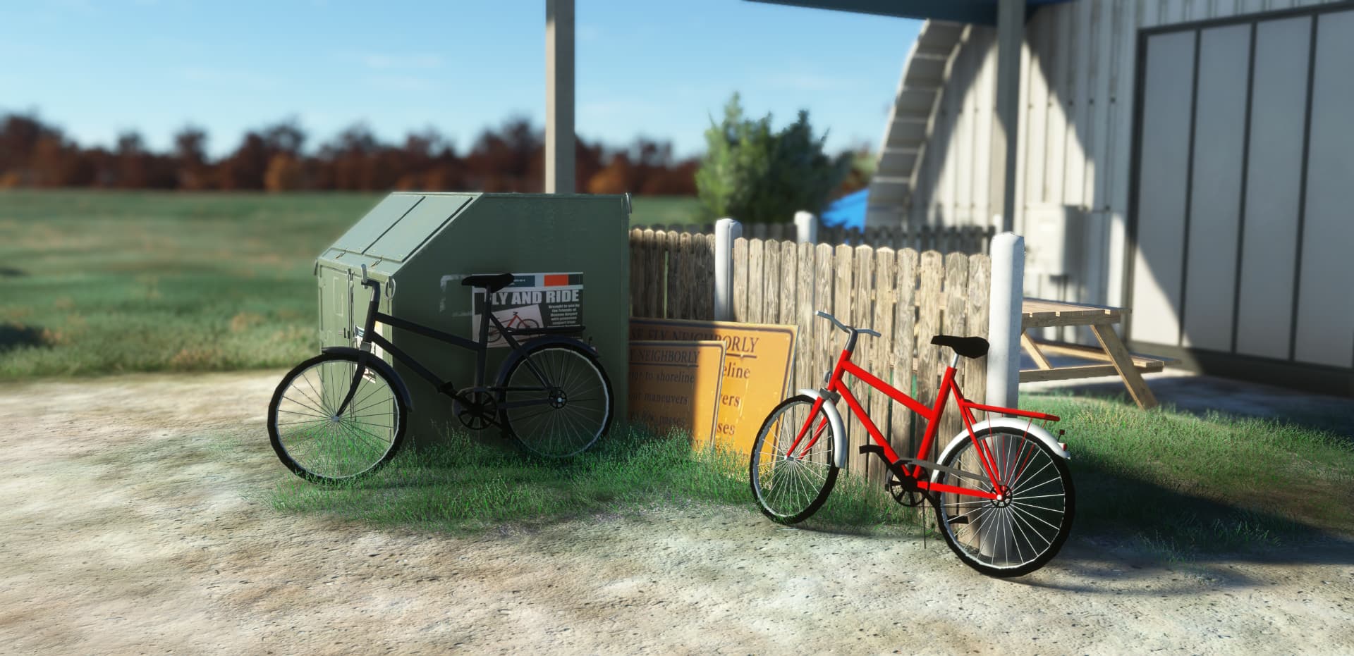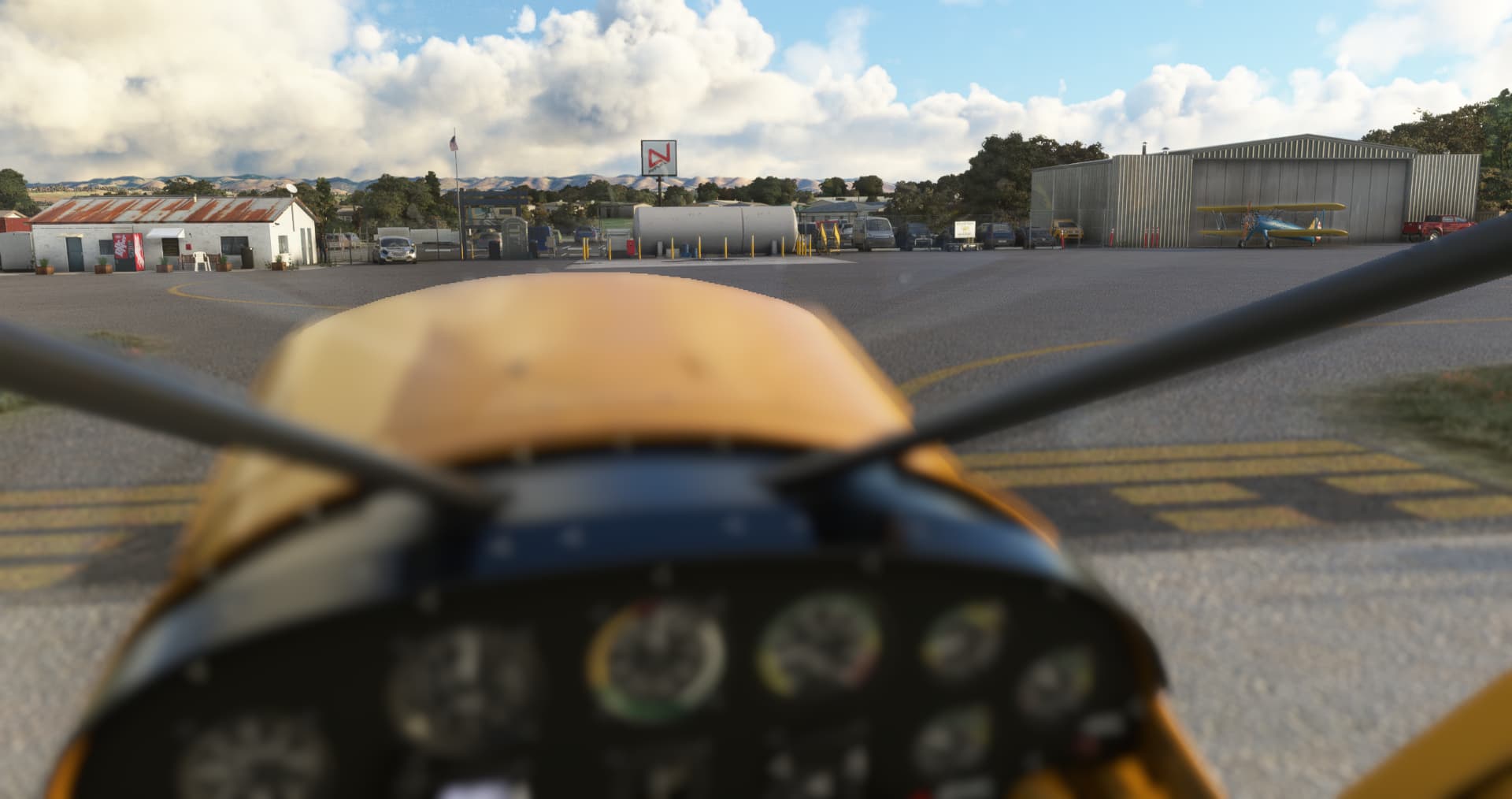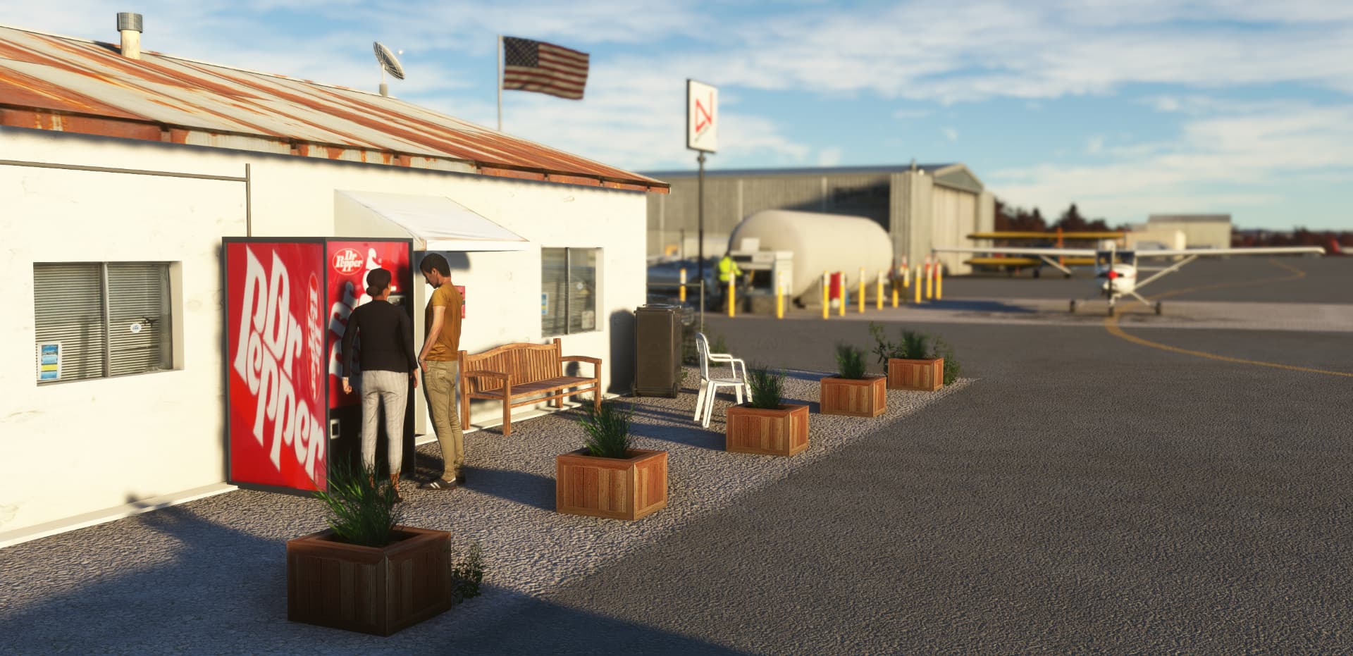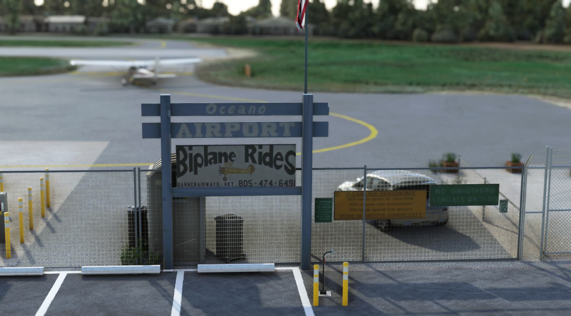 All airport buildings have been replaced: airport office and its pilot lounge, main entry gate and his numerous signs, fuel island, executive hangar, airport beacon, wind cone and segmented circle (WIP)… not to mention the famous campground. The scenery is available for free at https://flightsim.to/d/vbazillio/l52-oceano