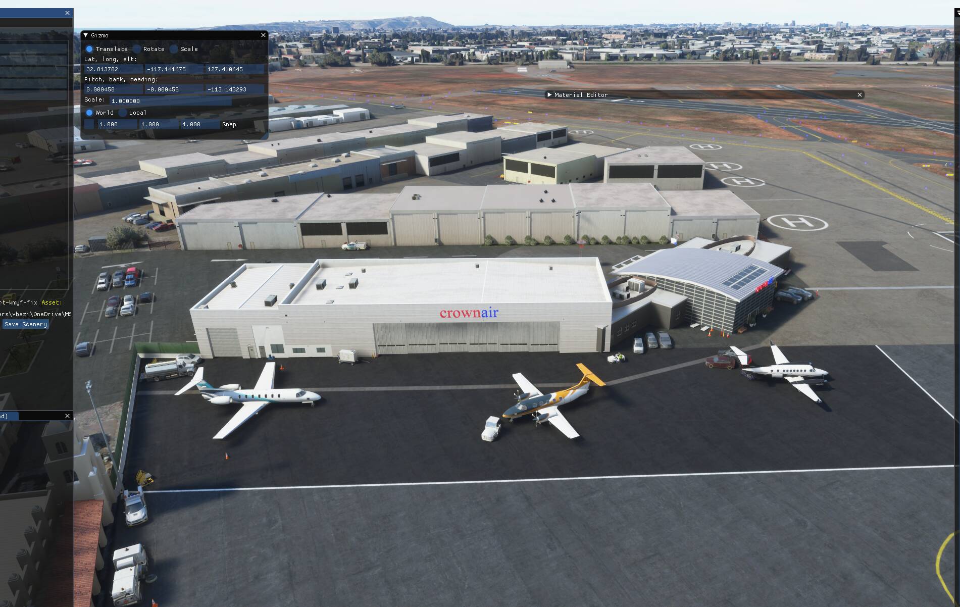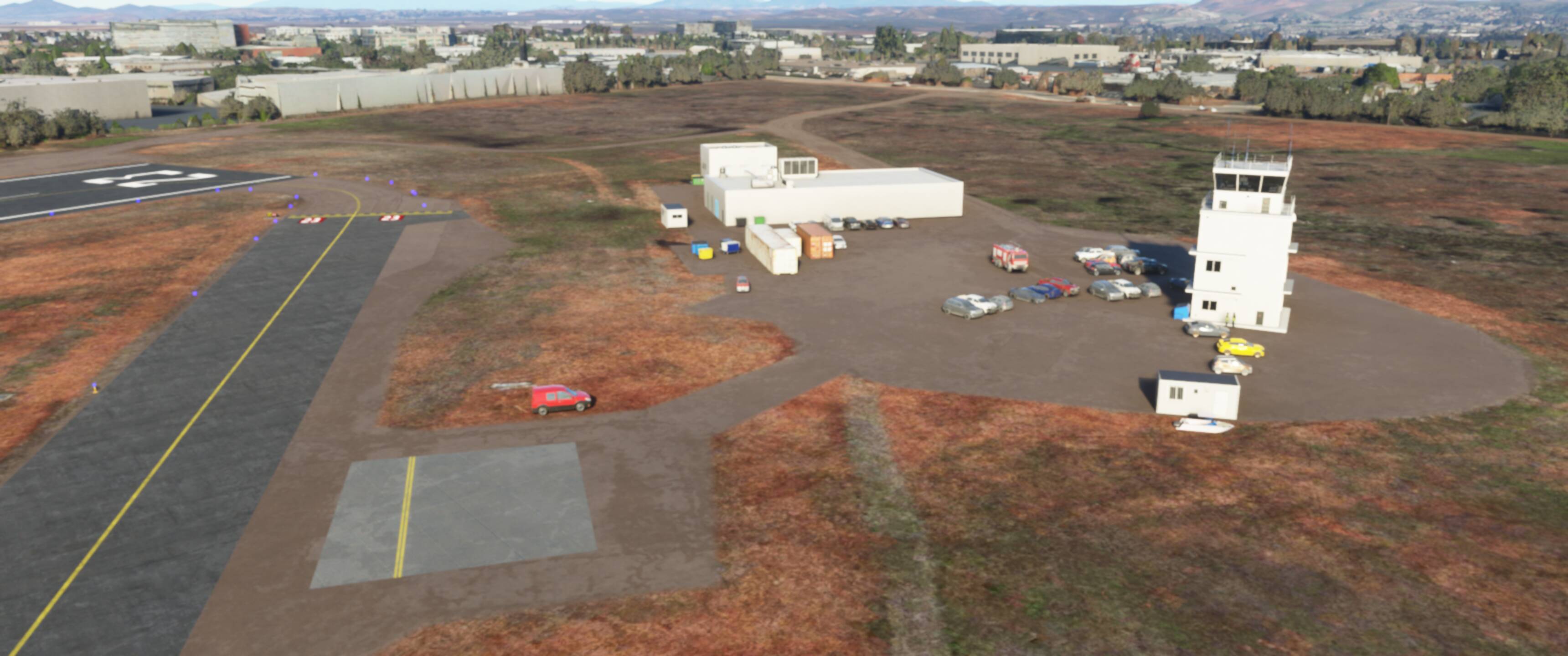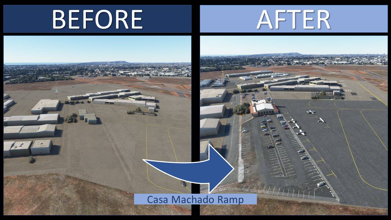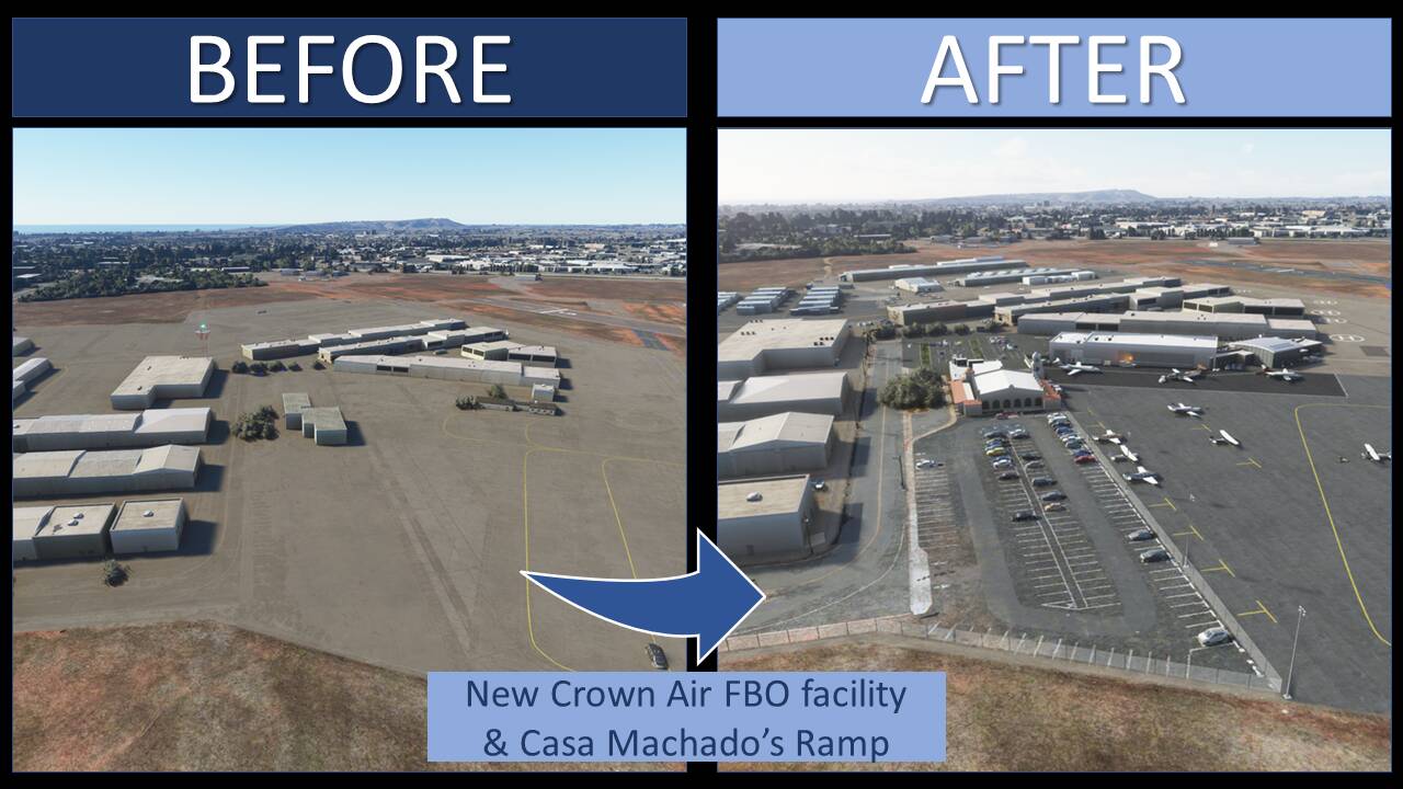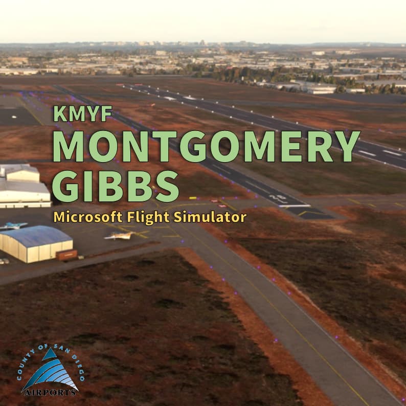 This is my first airport upgrade for MSFS, 99%* done with the MSFS Scenery Editor and default library objects.. KMYF is a public airport six miles north of downtown San Diego. The airport has three runways and lot of ramps and hangars. It’s one of the busiest airports in the U.S. for small aircraft and has a number of flying clubs, flight schools, plus business turboprops and jets based there. You also find San Diego Fire Department and the famous King Schools.