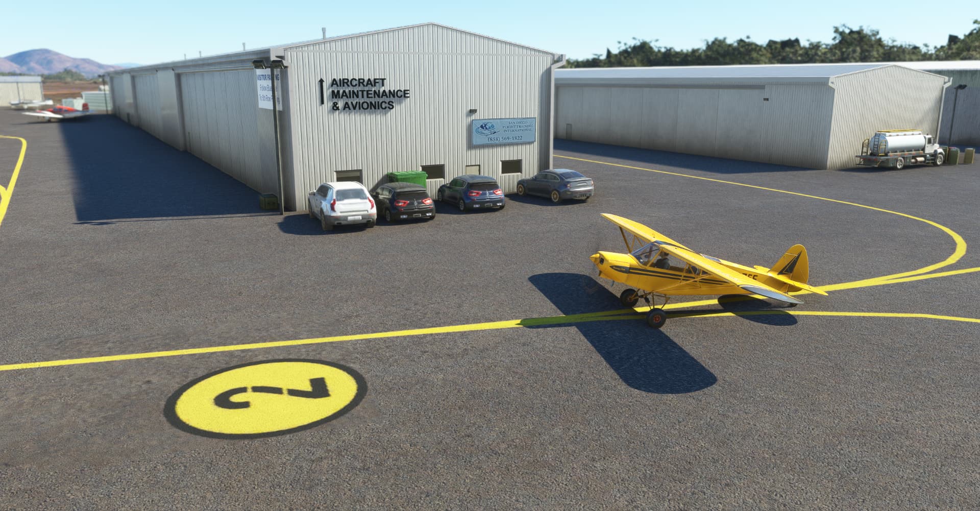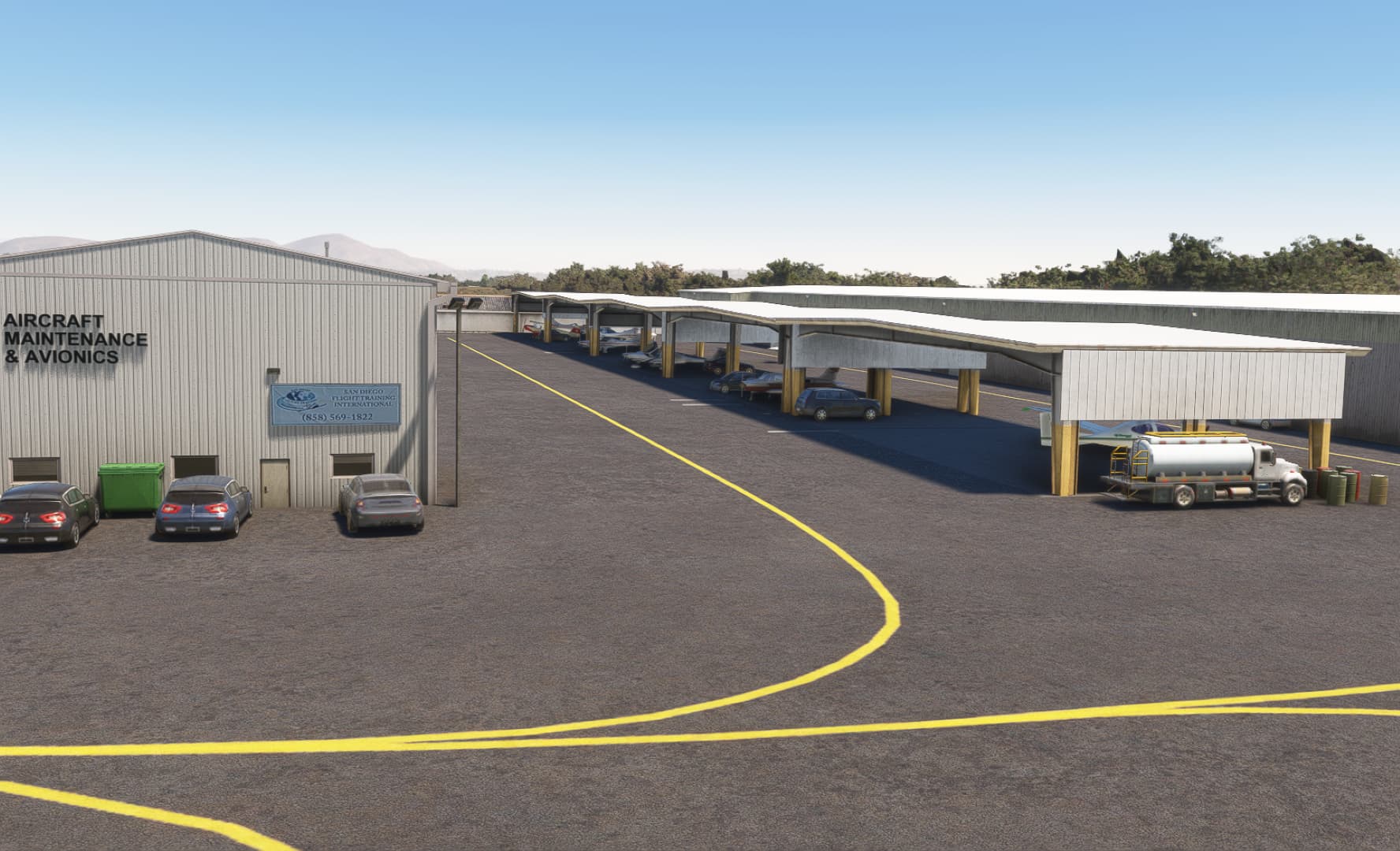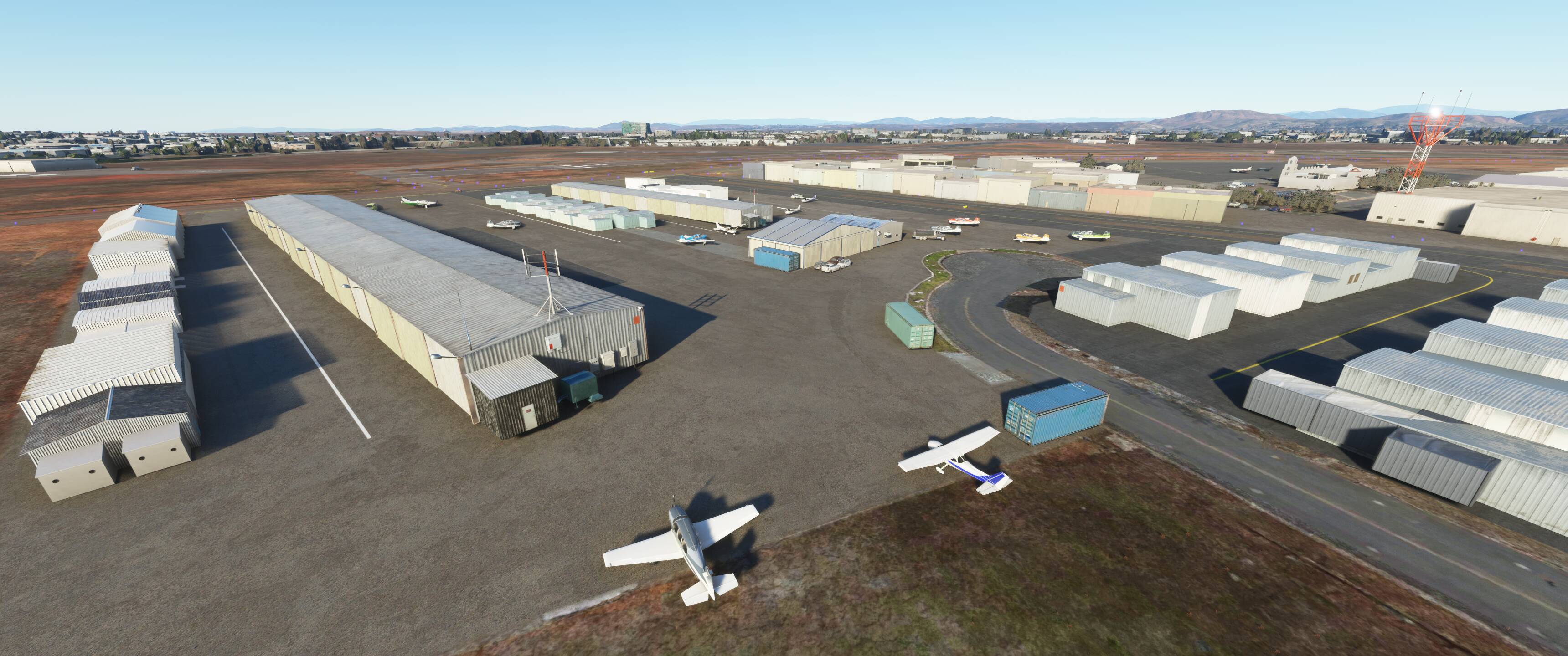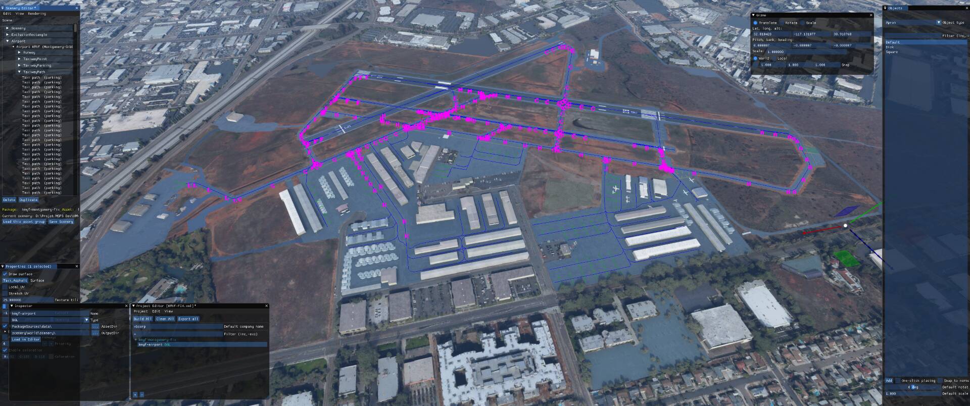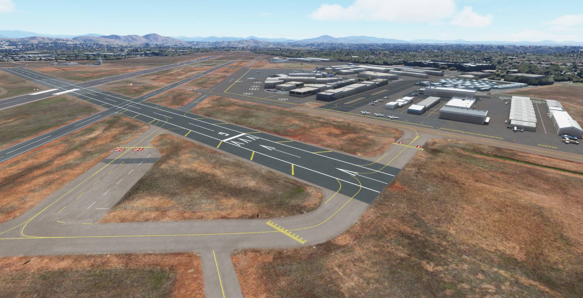 This is my first airport upgrade for MSFS, 99%* done with the MSFS Scenery Editor and default library objects.. KMYF is a public airport six miles north of downtown San Diego. The airport has three runways and lot of ramps and hangars. It’s one of the busiest airports in the U.S. for small aircraft and has a number of flying clubs, flight schools, plus business turboprops and jets based there. You also find San Diego Fire Department and the famous King Schools.
