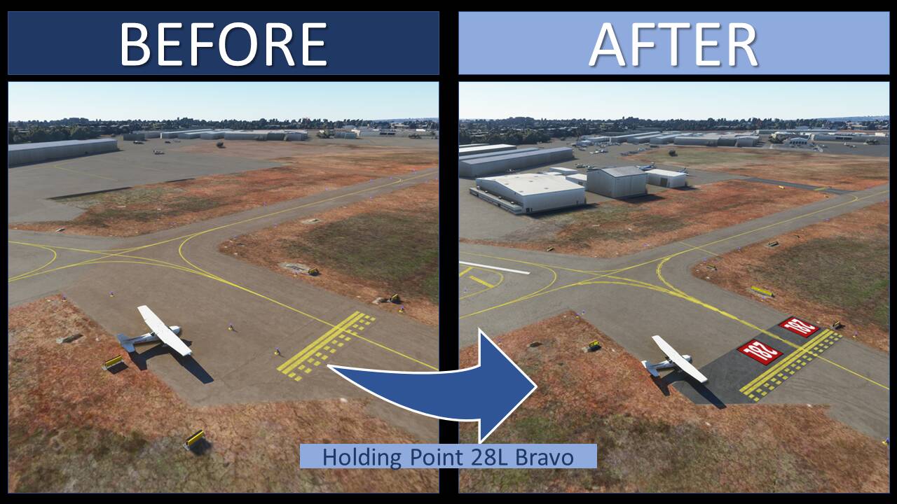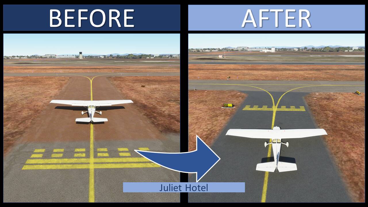 - Add and fix runway markings on several holding points (raise an MSFS limit on runway marking white on red)