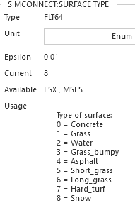 Now I slew across to the grass near the runway, and the surface type has changed to 1, indicating Grass. and Condition remains 1 for Wet: