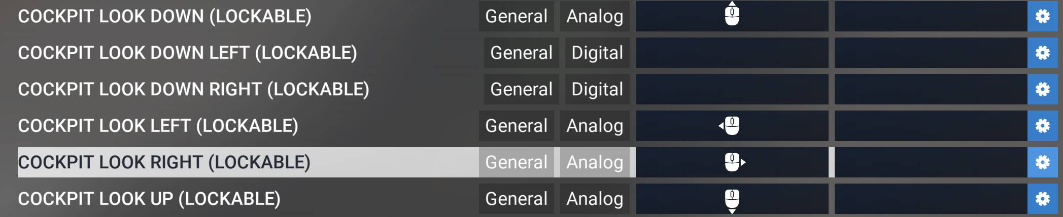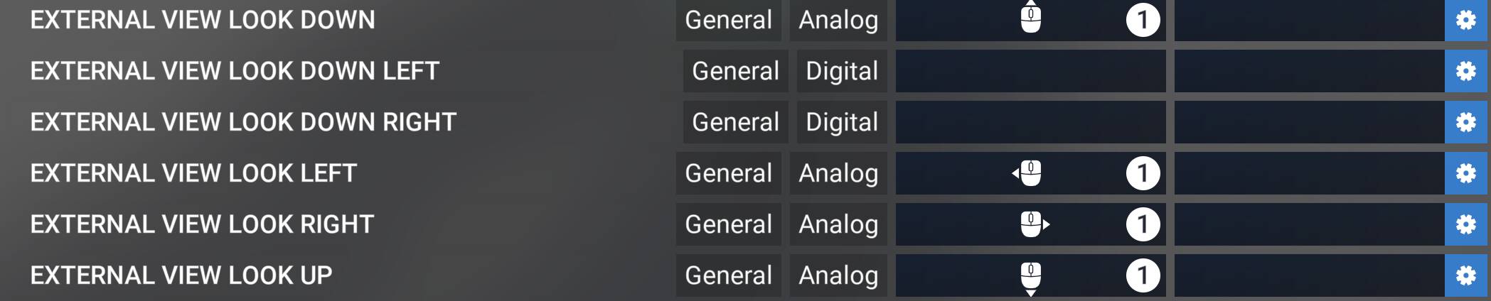 External View, Left, Right, Up, Down (Lockable) don’t work, so I have assigned the non lockable ones now which bypasses pressing and holding the right mouse button which is not what I want.
