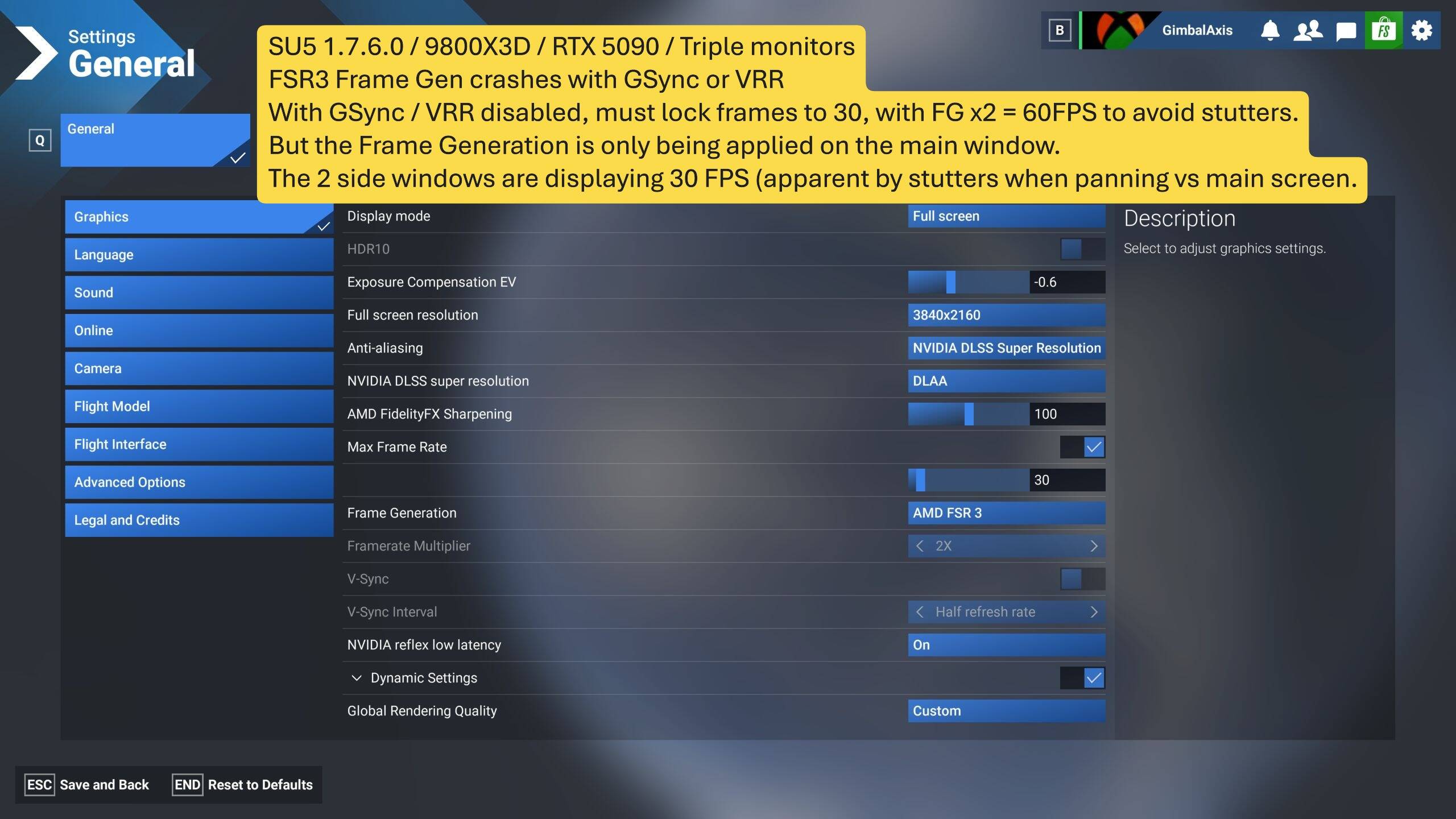- MSFS Graphics: Max Frames 30 / FSR3 Frame Gen x 2