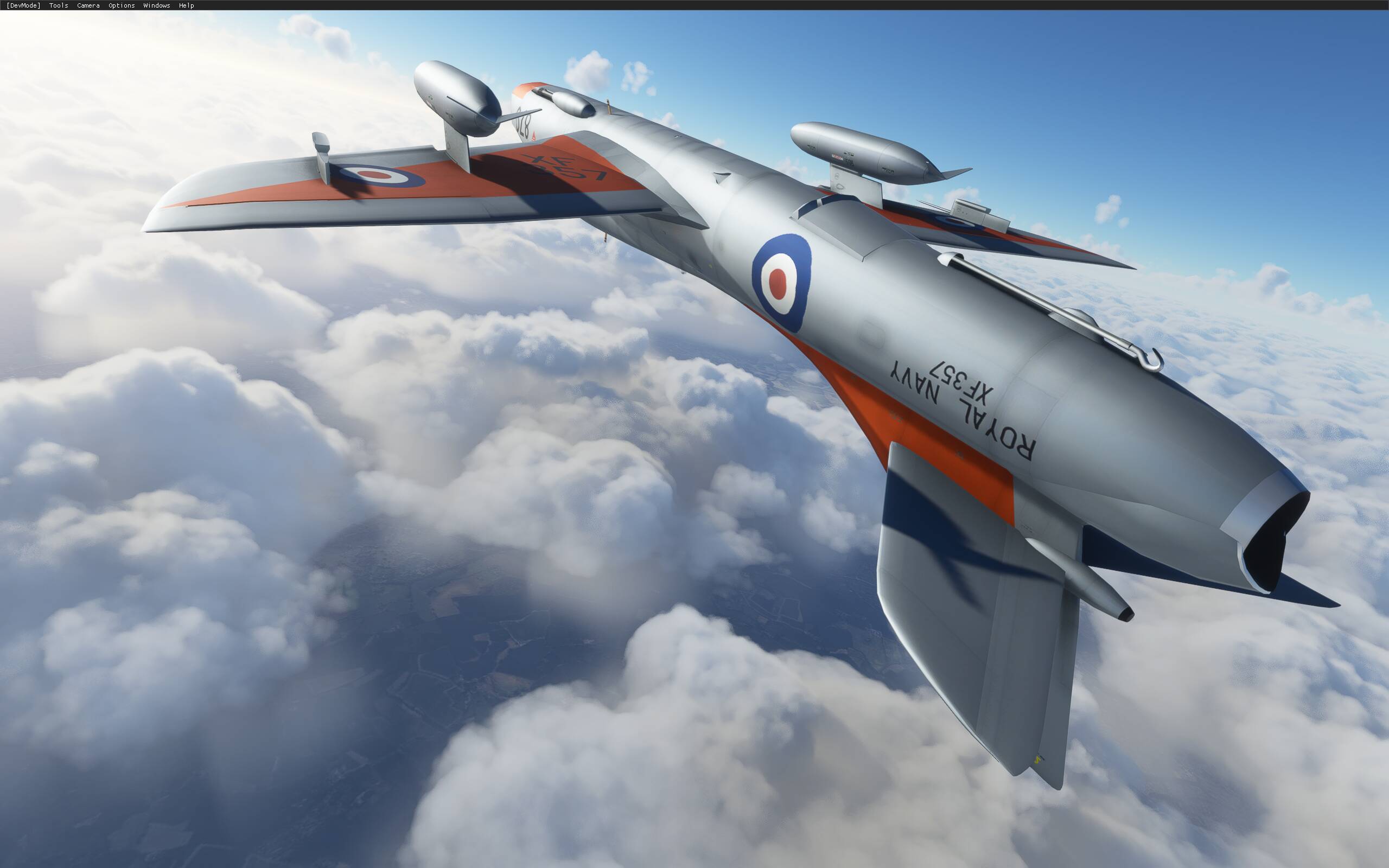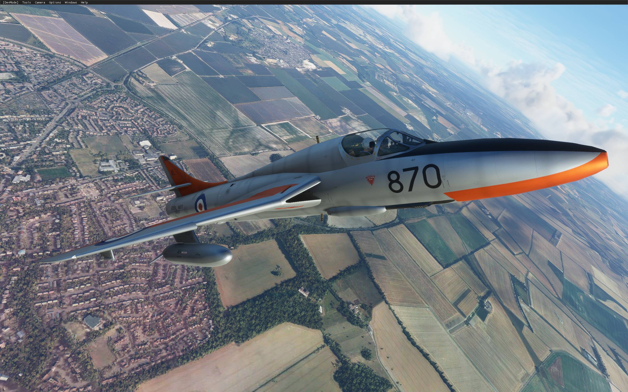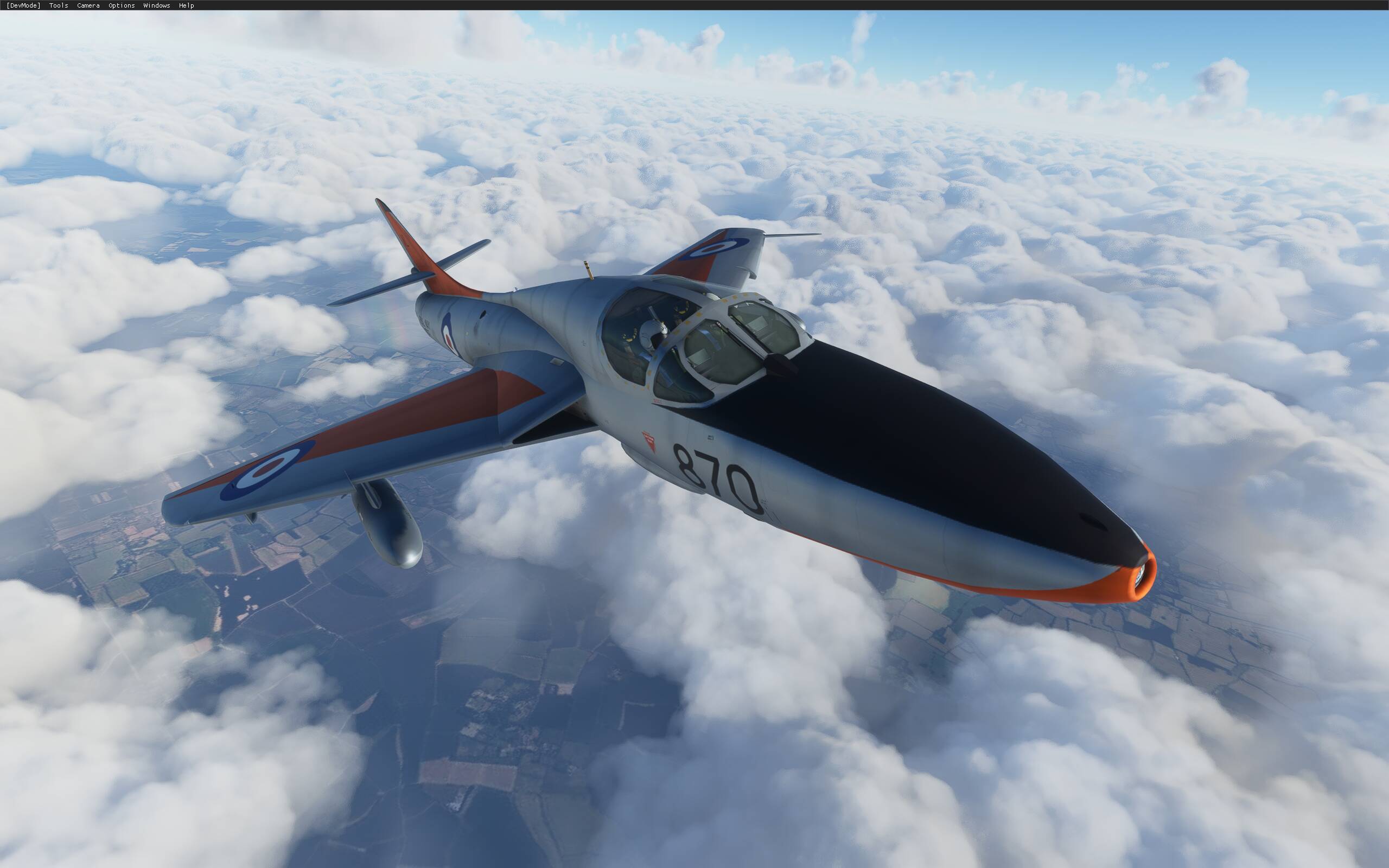 I loaded up Dave’s Hunter trainer variant today. I noticed that the canopy texture file, glass _t.dds, needs to have the alpha darkened to allow better visibility. I also noticed that the pilot’s helmet visors were showing through the canopy glass texture. The visors do not have a texture attached to them, so I tried to add one using MCX but the aircraft model ran into an error when recompiling. I’ll have to have a further look at this.